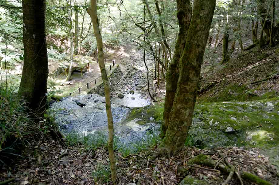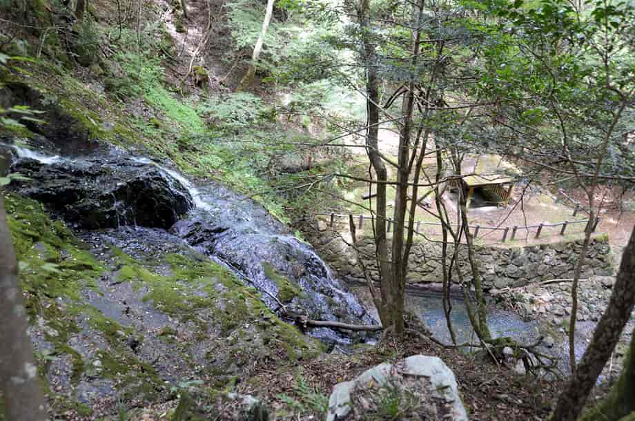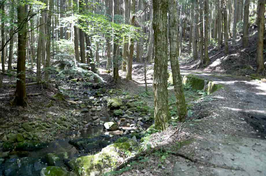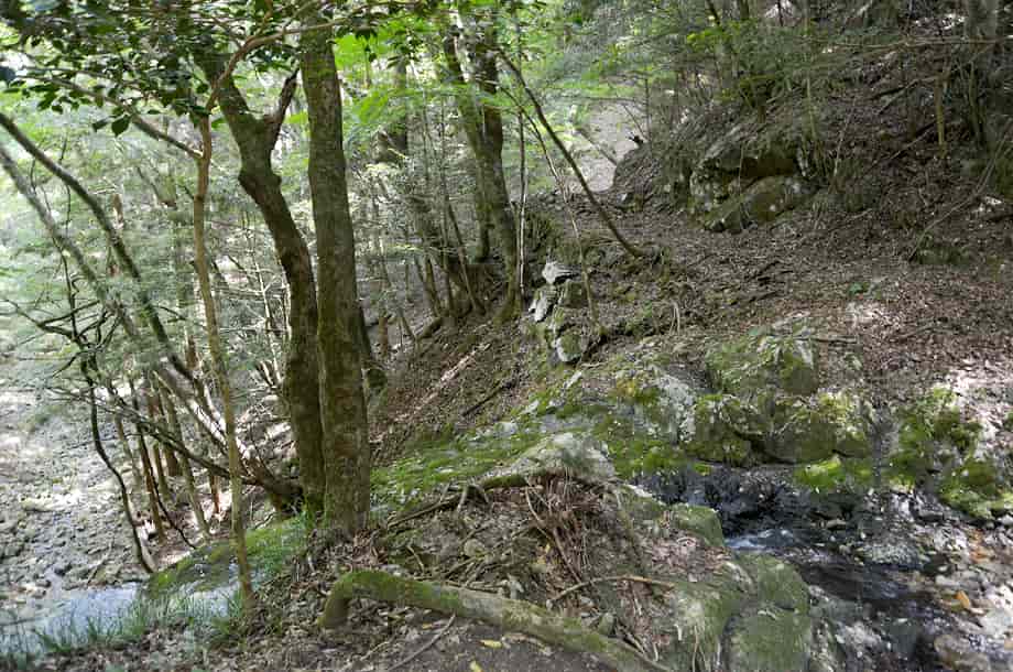 | ▲落ち口から続く山道 | ▲上流側の様子 |