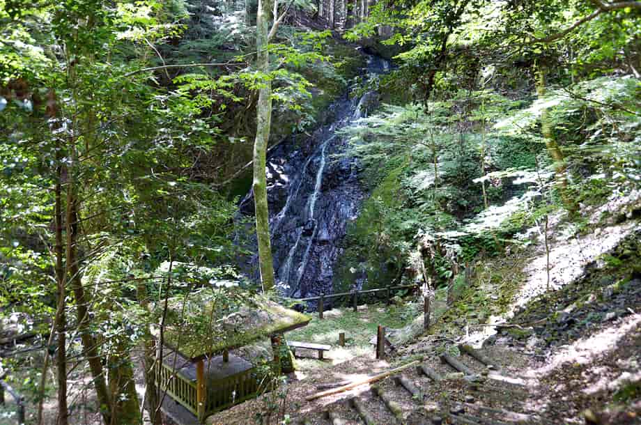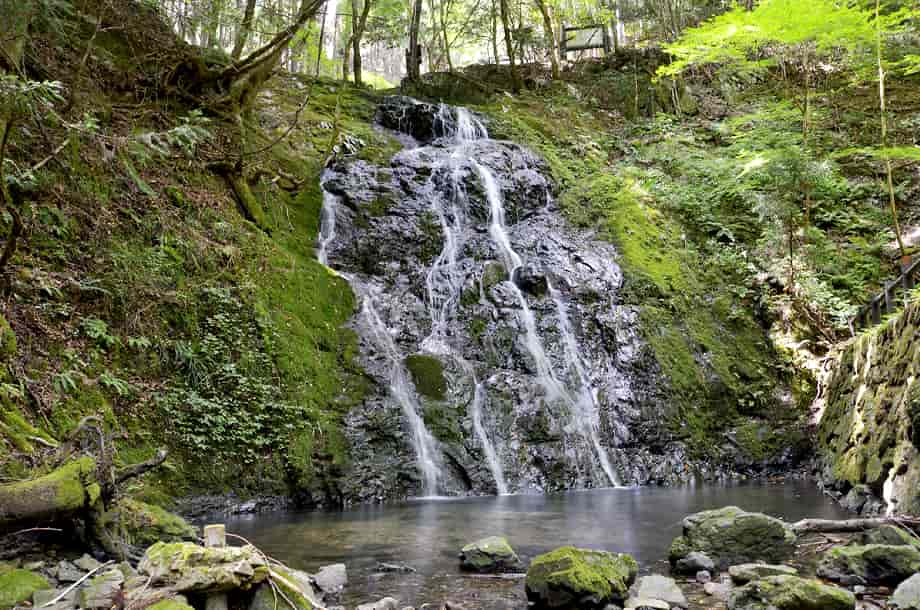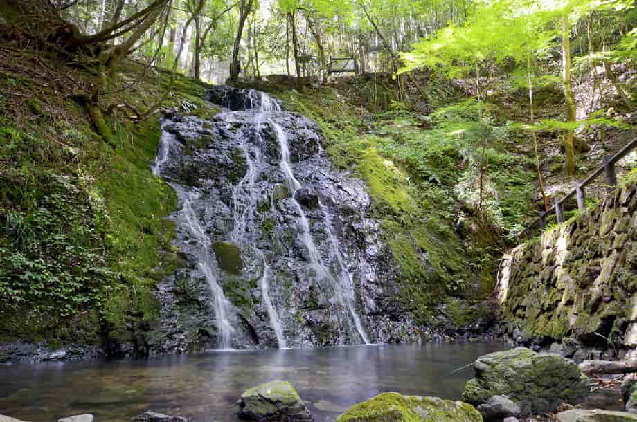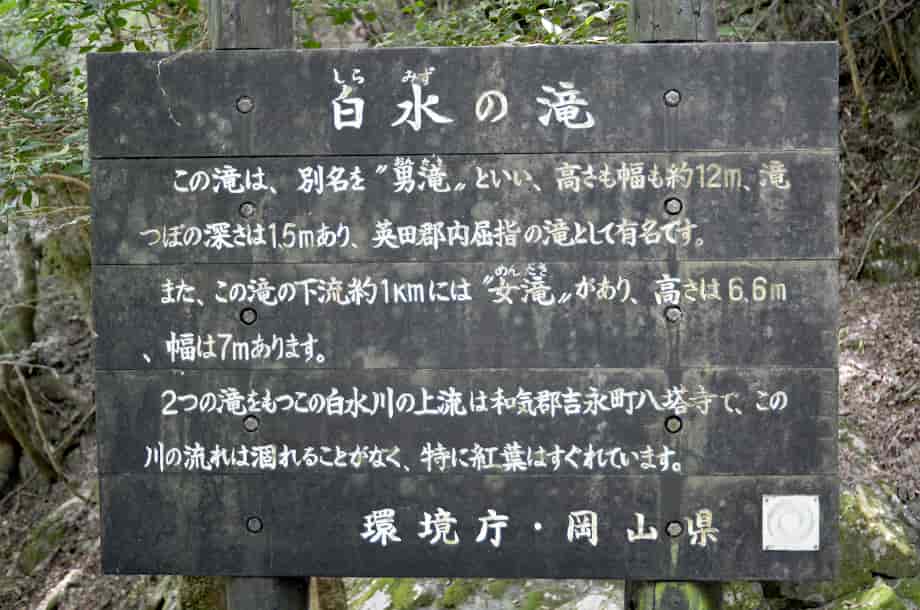 岡山県美作市にある「白水の滝」は、白水地区を流れる白水川に流れ落ちている。 別名・「男滝」とも呼ばれていて、水は荒い岩肌を幾筋かになって流れ落ちている。 その様子は、糸を引いているようにも見え、名前のように、黒い岩肌と白く見える水の対比が美しい。 落差は12〜13m程で、浅いながらも広い滝壺をもっている。 付近にある説明板によると、「滝壺の深さは1.5m」と書かれているので、このところは水が少ないのだろう。 水量が多いと、滝壺もそれ程の深さになり、水は岩肌を覆いつくすように流れるのだろう。 しかし、白水の滝は、水量が少なくても味わいがあり、滝前もよく開けているので清々しい。 林道から見下ろすこともできるが、やや斜めから見てみると、思っている以上に傾斜のある滝であることが分かる。 周辺もよく整備されていて、滝前には休憩所も建てられていて、林道からも遊歩道が整備されている。 美作市は、市の名勝地として「琴弾の滝」と「千早の滝」を文化財に指定しているが、この白水の滝も、それらに劣らずに素晴らしい。 どの季節の景観もよいように思うが、紅葉の時期にはいっそう見事な景観をつくり出し、訪れる人も多いことだろう。 白水の滝への交通・アクセス 白水の滝へは、自動車の場合、中国縦貫自動車道・作東インターからだと、インターを降りた先の交差点を「美作・佐用」方面へ向かって左折する。 左折して少し行くと山家川を越えるので、その先の交差点を左折する この交差点は国道179号線と交差していて、左折して国道179号線を3kmほど進んで行くと、道路右側に「↑姫路 51km・和気34km/角南3km →」の案内標識があるので、この交差点を右折して「和気」方面へ進む。 右折して道なりに走って行くと、やがて県道46号線に突き当たるので、この交差点を右へ曲がる。 この交差点の正面には「琴弾の滝 10km →」の案内標識もあるので、それにも注意するとよい。 右折して少し行くと、道路左に橋が架かっていて、その所に「← 1.3km白水・角南」の案内標識が立てられているので、この分岐を左折して橋を渡る。 橋を渡った先は、すぐに左へ向かい、しばらく道なりに走って行く。 左折してからの道は細くなるが、舗装もされているので、特に問題はない。 やがて、道が二又に別れるところがあるので、この分岐は右折する。 進行方向からだと見えづらいが、右の角に「←女滝」の案内標識が立てられているので、そちらへ向かって右折する。 (下の写真は、案内板が見えるよう、進行方向からだと左側から撮影している) 右折してからの道も細くて林道のようになるが、あとはそのまま進んで行く。 林道には小さな落石などはあるが、舗装されているので、注意して進んで行くようにすればよい。 道なりに進んで行くと、林道左に「白水の滝」の説明版が立てられていて、自動車は、付近がやや広くなっているので駐車することができる。 ここまで、作東インターから20〜25分程で、説明版辺りから滝や休憩所が見えるので、近くの遊歩道を降りていくと、程なく滝前に着く。 また、途中にある女滝は、ここから1kmほど下流側に流れ落ちていて、落差6〜7m程あると言われているが、この時は残念ながら、分からずに見落としてしまった。 |
