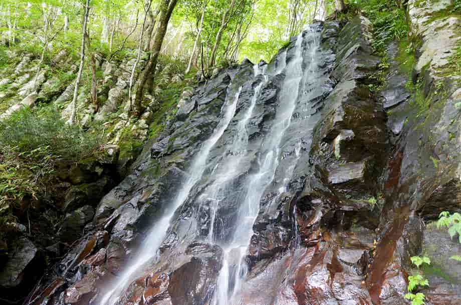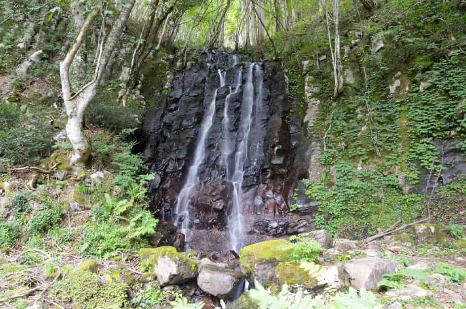 岡山県津山市にある「大滝」は、阿波(あば)地区を流れる落合川の枝沢に流れ落ちている。 落差は10m程で、水は幅のある黒っぽい岩肌を流れ落ちているが、この岩肌は、下方部分で赤みを帯びていておもしろい。 また、規則的にも見える凹凸があるので、光の具合でやや違った色に見えるのも味わいがある。 この時の水量は多い方ではないと思うが、幾筋かになって落ちる水の様子は清々しい。 広くはないが、はっきりとした滝壺が見られるので、降雨の後などは、滝壺の水も溢れるようになるのだろう。 大きな滝ではないが、水量が多く、岩幅いっぱいに水が流れ落ちていれば、「大滝」の名前に相応しい景観を現わすことだろう。 大滝への交通・アクセス さて、大滝へは阿波地区にある「あば森林公園」を目指すことになるが、自動車の場合、中国縦貫自動車道・津山インターからだと、インターを降りた先の交差点を右折して、「鳥取」方面へ向かう。 しばらく道なりに走って行くと、「野村」の交差点があるので、ここを左折して、すぐに右折する。 「野村」の交差点はやや変則な交差点で、大滝へは、半ば直進するように右の道へ進むことになり、その先にあるJRの踏切の手前を右折する。 交差点には、「奥津川ラビンの里・あば温泉・大高下ふるさと村」などの案内標識もあるので、それに従って進んで行くとよい。 半ば直進するような道は県道6号線で、しばらくは道なりに走って行く。 やがて、JR因美線・美作河井駅付近を過ぎた先の加茂川に架かる橋の辺りに、「← 14km 大ヶ山・11km 布滝」の案内標識があるので、その先の交差点を右折する。 この交差点は三差路で、ここにも「← 阿波」などの標識があるので、この分岐を左折して阿波方面へ向かう。 左折した道は県道118号線で、そのまま走って行くと、「あば森林公園・布滝 →」などの案内標識が道路右側にあるので、この分岐を右折する。 あとは道なりに走って行くと、あば渓流釣場や、よく整備された森林公園の前を通り、やがて道路右に「大滝」の案内板が立てられている。 ここから右への脇道が延びているが、道路左は広場のようになっているので、すぐに分かる。 また、県道を右折してからの道は細くなるが、舗装されているので問題なく走ることができ、途中の分岐などにも案内板が立てられているので、迷うようなこともない。 ここまで、津山インターから45〜50分程で、案内板のところから右への脇道へ入っていけば、すぐに駐車場に着く。 大滝へは、ここから右の山道を登って行くが、山道と言っても作業道のようになっていて、そのまま歩いて行くと、5分程で滝前に着く。 ただ、この道は距離はないが緩やかな登りが続くので、ゆっくりと歩いて行くようにすればよい。 また、駐車場の奥に鳥居が見えるが、そちらへ向かえば「白髪滝」がある。 更に、林道を更に進んで行けば総落差50mほどの「布滝(のんたき)」があり、阿波地区には見応えのある滝が幾つかある。 |