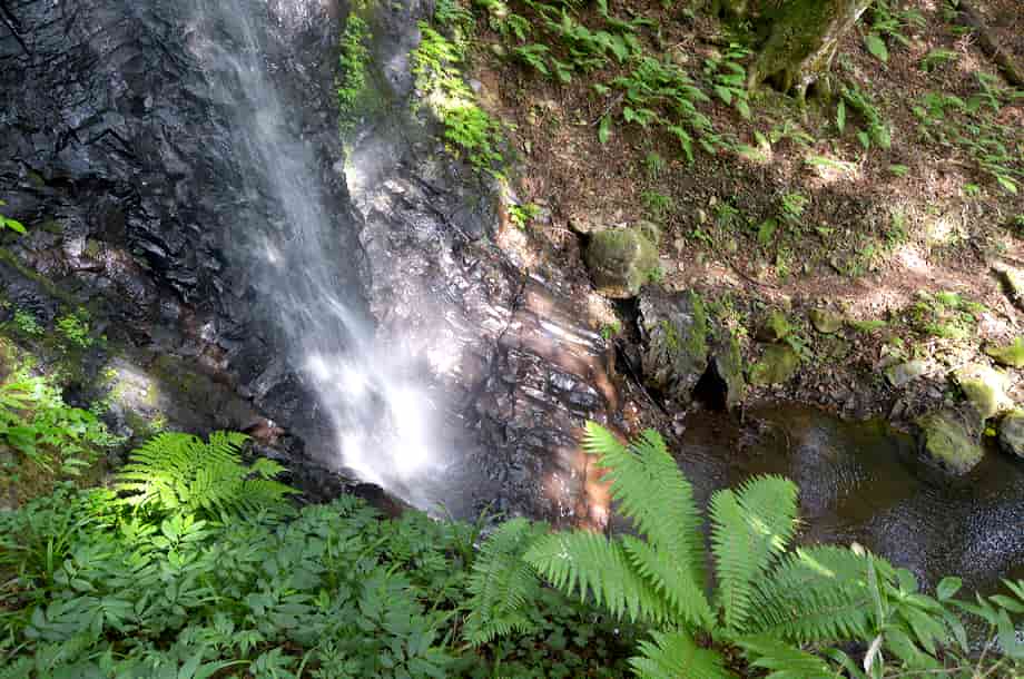 | ▲祠から見る滝壺 | ▲落ち口の様子 |