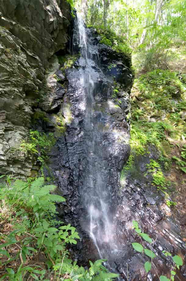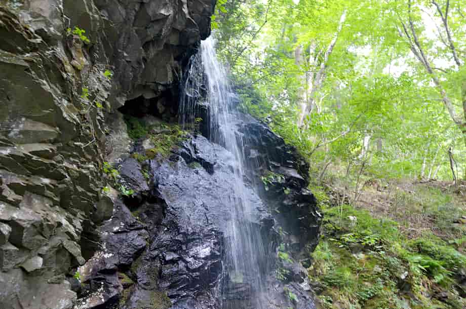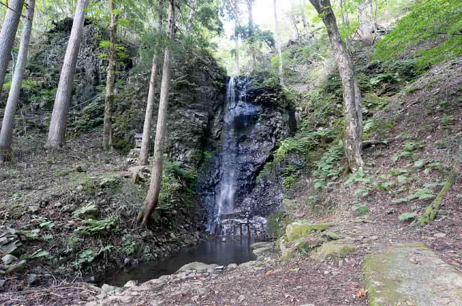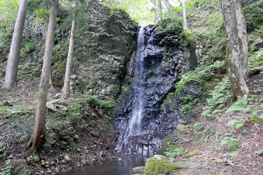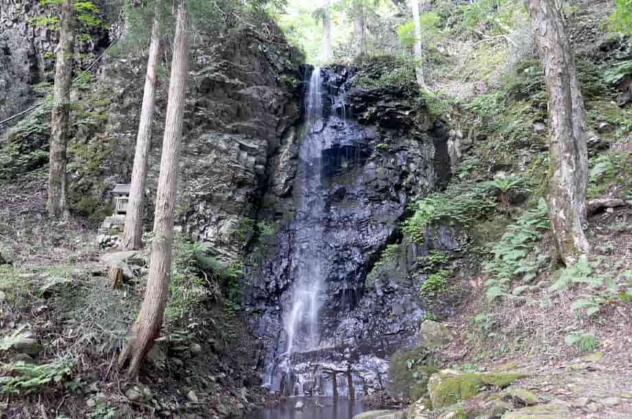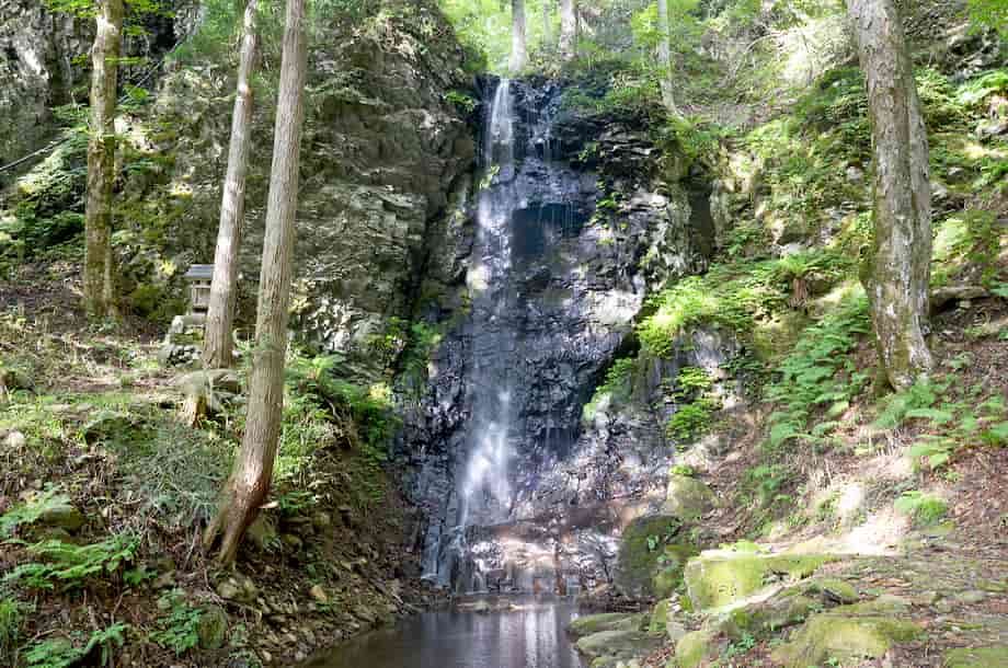 岡山県津山市にある「白髪滝」は、阿波(あば)地区を流れる落合川の枝沢に流れ落ちている。 落差は15m程で、近くにある「大滝」よりも大きく、先に大滝を見ると、僅か5m程の違いだが、白髪滝はずっと大きく感じられる。 岩肌や辺りの様子が違っているからだろうが、遊歩道から遠望したときも、大きな滝である印象を受ける。 それにしても、「白髪滝」とはあまり聞かない名前だが、黒い屏風状の岩から、白髪のごとく細い水が流れ落ちていることから付けられたらしい。 成程、流れは細く、その様にも見えるので、この滝は枝沢にある滝でもあるので、普段から水量が多くないのかもしれない。 しかし、大滝と同様、白髪滝にも滝壺が見られ、こちらの方がはっきりとしている。 また、滝までの遊歩道の入り口には白髪滝神社の鳥居があることから、この滝が信仰の滝であることはすぐに分かるが、滝の脇には祠が建てられている。 残念ながら、祭神は分からないが、この祠は、簡易ながらも石組みの土台の上に建てられていて、古くから大切にされてきたように見える。 駐車場を含め、遊歩道はよく整備されていて、近くの大滝への道も、新たに整備されたようである。 しかし、どちらの滝も、道が整備される前は、山深く、より閑静なところだったのだろうが、その頃から、白髪滝には祠が祀られ、信仰の対象にもなっていたのだろう。 いずれにしても、白髪滝は落ち着いた感じを受ける滝で、水量もこれほどがよいのかもしれない。 白髪滝への交通・アクセス さて、白髪滝の付近には大滝があるが、自動車の場合だと、駐車場は同じところになる。 大滝までの交通はそのページで紹介しているので、駐車場からだと、すぐ先にある鳥居を潜り、少しばかり遊歩道を歩いて行くと滝前に着く。 鳥居の辺りからでも奥に遠望することができ、祠の前へ続く遊歩道も整備されている。 この祠のところから見ると、落差もよく分かり、滝壺や落ち口の様子などを垣間見ることができる。 滝の手前には簡易ながらベンチも設置されているので、ゆっくりと時間を過ごすこともできる。 |