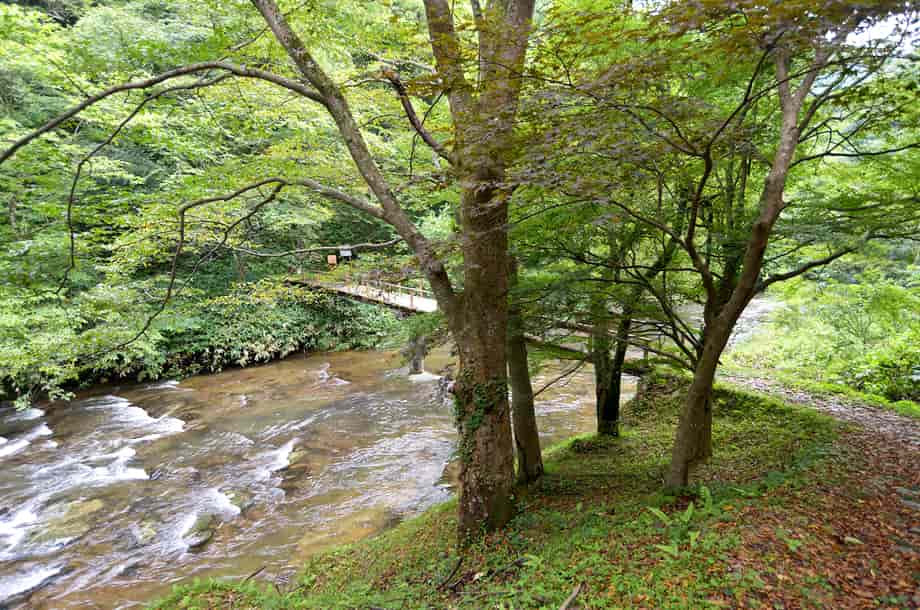 島根県雲南市にある「八重滝」は、掛合町地区を流れる三刀屋川の支流・八重山川から民谷川に流れ落ちている。 名前のように、「八重滝」は八つの滝の総称だが、下流側から、猿飛滝、滝尻滝、紅葉滝、河鹿滝、姥滝、姫滝、八塩滝、八汐滝と続いている。 最も奥にある八塩滝と八汐滝は、ひとつの段瀑のようになっていて、落差は合わせて40m程と言われている。 渓流沿いに遊歩道が整備されているが、ちょうど中程にある休憩所から先は、次々と滝が現れ、飽きることがない。 もちろん、休憩所までの渓流の様子も清々しく、素晴らしい。 この時は植物がよく繁茂する時期に訪れたが、渓流沿いには楓も多く、秋には見事な景観を現わすことだろう。 駐車場から最上流にある八汐滝まで、開けた渓流の様子のほか、峡谷のような景観も現れ、歩いていても変化を楽しめる。 渓流の眺めも素晴らしく、強く心に残るが、最後に辿り着くふたつの滝を見た時には、思わず感嘆する。 この時は水量も特に多かったのだと思うが、力強い水の流れには圧倒される。 冬期には雪に閉ざされてしまうのだろうが、この渓谷は四季折々に素晴らしい様子を現わすことだろう。 やや離れてはいるが、同じ雲南市にある「龍頭が滝」とと共に「龍頭八重滝」とも呼ばれていて、どちらも「日本の滝百選」に選ばれている。 県立自然公園にも指定されているが、この八重滝渓谷とも呼ぶべく渓流の様子は、強く印象に残る。 ところで、付近には「八重山神社」があるので、「八重滝」の名前は、元は「八重山」などから付けられているのだろうか。 もっとも、その八重山などの名前に八つの滝を合わせての名前だと思うが、八重滝とは響きのよい名前だと思う。 また、八重山神社は、岩壁の窪みに拝殿や本殿が建てられている特徴のある神社で、旧松江藩とも所縁が深い。 随身門にある隋神像と狛犬は、「石見銀山」にある五百羅漢の作者・坪内平七郎利忠の作とされていて、珍しい型をしている。 八重滝への交通・アクセス さて、八重滝へ向かうには、国道54号線から入っていくことになる。 自動車の場合、松江自動車道・吉田掛合インターからだと、インターを降りてそのまま進むと突き当りになり、県道38号線と交差する。 交差点の正面には「龍頭が滝 13km →」、「八重滝 9km →」などの案内標識が立てられているので、ここを「飯南・掛合」方面へ向かって右折する。 そのまま県道38号線を進んで行くと、やがて突き当りになり、手前に「← 八重滝 6km」、「龍頭が滝 9km →」の案内標識があるので、その先の分岐を「赤来高原・頓原」方面へ向かって左折する。 左折した道は国道54号線で、あとは道なりに進んで行くと、インターから15分程で、「← 八重滝」の案内標識があるので、ここが八重滝への入り口になる。 この分岐を左折して橋を渡ると、すぐに「猿飛滝」があるが、そのまま進んで行くと道路左に大きな駐車場ある。 駐車場には付近の案内板も立てられていて、一番奥にある八塩滝・八汐滝まで遊歩道が整備されている。 各所に滝の名板や案内図なども設置されているので、道に迷うようなことはなく、遊歩道も歩きやすい。 また、もっとも上流側にある八汐滝(一の滝)まで、40〜45分程度だが、この時は、落石などの影響で途中の左岸側の遊歩道が通行止めになっていたので、場合によっては事前に確認しておく方がよいかもしれない。 |