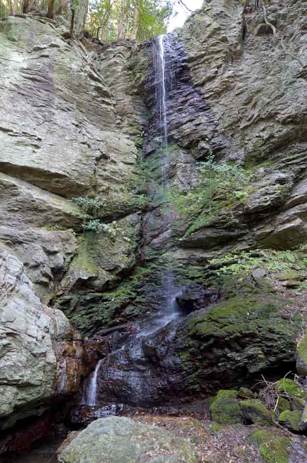 徳島県徳島市にある「蔵王の滝」は、八多町地区を流れる八多川の枝沢に流れ落ちている。 五滝(八多五滝)と呼ばれている内のひとつで、もっとも上流側に流れ落ちている。 22m程の落差があるとされていて、五滝の中ではもっとも大きい。 水量が少ないのはやや残念だが、大きな岩壁から流れ落ちる様子は、「蔵王」の名に相応しくも感じられる。 下方部分では流れが変わるが、まっすぐに水が流れ落ちる様子も清々しく、小さな滝壺も見られる。 そこからの流れは、少し先で段瀑をつくっていて、そちらにははっきりとした滝壺が見られる。 その辺りから蔵王の滝を眺めると、堂々とした印象があり、奥行きのある景観を楽しむこともできる。 五滝最後の滝としても相応しく思われ、ここから先へも婆羅尾休憩所への山道が続いている。 蔵王の滝の普段の水量は分からないが、水量があれば見事な様子を現わし、圧倒されるような景観をつくり出すのだろう。 できれば、いつかはその様な姿を見たいものだと思っている。 ところで、山道入り口の石柱には「象の瀧」と刻まれているが、その近くに立てられている「四国のみち」の標柱に掛けられている名板には「蔵の滝」と記されている。 また、滝近くの名板には「蔵王の滝」と表記されているが、いずれが本来のものかは分からない。 ただ、滝前にある石の祠には「蔵王権現」と書かれた岩が祀られているので、「蔵王の滝」が本来のものかもしれない。 蛇足だが、「蔵王」は元来「ぞうおう」と読まれ、これが訛って「ざおう」となっているが、「象」と「蔵」も「蔵王」の元来の表記を現わしたものなのだろう。 いずれにしても、この滝は古くから信仰の滝として大切にされてきたことが窺える。 蔵王の滝への交通・アクセス さて、五滝の入り口まではそのページで紹介しているので、蔵王の滝は、山道入り口から500〜600m程のところにある。 山道ははっきりとしていて歩きやすく、所々の樹木には、目印になる赤や白のテープなども巻かれている。 途中には分岐もないので、そのまま歩いて行けばよいが、下流側にある「御来光の滝」からの道はやや険しくなる。 御来光の滝からの上り坂を上ってくると、やがて「布引の滝」に着くが、滝の近くには休憩所が設けられているので、滝を見ながら、ここで一息入れるのもよい。 布引の滝からも上り坂が続き、途中では急な石の階段なども登らなければならい。 この石段の脇には小さな渓流滝が流れ落ちているが、山道は更に上りが続いていく。 しかし、道ははっきりとしているので、そのまま歩いて行くと、やがて名板と石組みの土台の上に祀られている祠が目に入る。 蔵王の滝は樹木に隠れて見えないが、少し近づくと全体の様子をとらえることができる。 ここまで山道入り口から25〜30分程だが、途中の滝を見たりする時間や、上りが続くこともあるので、もう少し時間がかかるかもしれない。 |