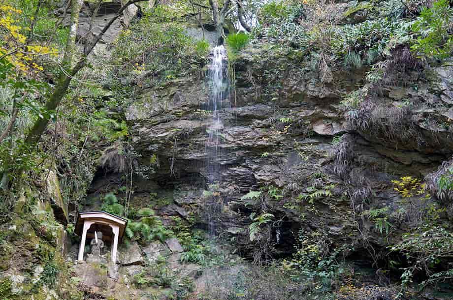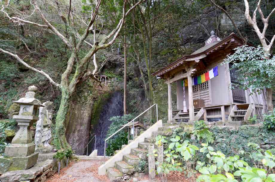 徳島市にある「鳴滝」は、飯谷町地区を流れる勝浦川の枝沢に流れ落ちている。 落差20m程の滝で、はっきりとした滝壺をもっている。 水の流れ落ちる様子もおもしろく、落ち口から垂直に落ちた水は、途中から岩肌を濡らし、末広がりになって落ちていく。 県道からそれほど離れていないのだが、辺りは思ったよりも閑静で清々しく、時折鳥の声も聞こえる。 ただ、鳴滝は一年を通して水が枯れることがないと言われているが、この時は水量が少ないようではあった。 しかし、訪れた時は水が少ない時期でもあったので、水量が多い時には、岩肌一面を水が流れ落ちるのだろう。 鳴滝の岩肌を見ると、水によって削られ、磨かれたようになっているが、このような岩肌になるには、随分と長い年月が必要だったのだろうし、程よい水量もあったのだろう。 また、滝付近はよく整備されていて、石橋が滝前を横切ってもいるが、周辺の自然はよく残されている。 春の桜や夏の緑、秋の紅葉など、四季折々の景観が楽しめそうだが、冬には大氷柱を見れることもあると言われている。 ところで、鳴滝は信仰の対象にもなっていて、滝の近くには立派な大師堂も建てられている。 滝近くにある説明版などによると、大師堂は「洞友庵」と呼ばれ、堂内には、弘法大師・空海が天竺から投げたとされる「投げ卒塔婆」が置かれていたようである。 この卒塔婆を削って煎じて飲むと腹痛や万病に効くと言われていたが、残念ながら、現在ではなくなってしまっている。 また、大師堂の前には不動尊が祀られているが、滝が流れ落ちる岩肌にも不動尊が安置されている。 この不動尊は享和元年(1801年)に納められたもので、天明の大飢饉が終わったころ、付近の村民によって建てられたと言われている。 大師堂の前のものは大正9年(1920年)に建立されたもので、第一次世界大戦が終わり、国際連盟が設立された年にあたり、世界の平和を祈念したものと言われている。 ところで、鳴滝から10分程山道を登ると奥の院があるが、更に山道を登って行くと「小鳴の滝」がある。 鳴滝の上流側にある滝で、奥の院から更に20〜30分程山道を登ったところにあるらしいが、この時は訪れていないので詳細は分からない。 鳴滝への交通・アクセス さて、鳴滝へは、自動車の場合、徳島市の市街地からだと、国道55号線を小松島・阿南方面へ向かって南へ走る。 しばらく道なりに走っていくと小松島市に入り、勝浦川を越えるようになる。 勝浦川を越えたところに「勝浦川橋南詰」の交差点があるので、ここを右折して「県道16号線 上勝・勝浦」方面へ向かう。 あとは道なりに走っていくと、10分程で、「←200m 鳴滝」の案内標識がある。 案内標識はよく目につくので見落とすことはなく、この案内標識は、反対方向からでも見えるようになっている。 ここを左折して進んで行くと200m程で滝前に着くが、途中にも案内板が設置されている。 滝前には2台分ほどの駐車場があるので、自動車はそこに止めることができる。 徳島自動車道・徳島インターからでも、国道11号線から国道55号線を経て県道16号線へ進むが、徳島インターから30〜35分程で滝前に着く。 |