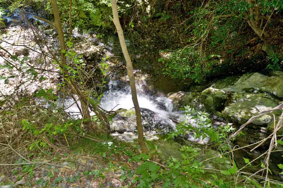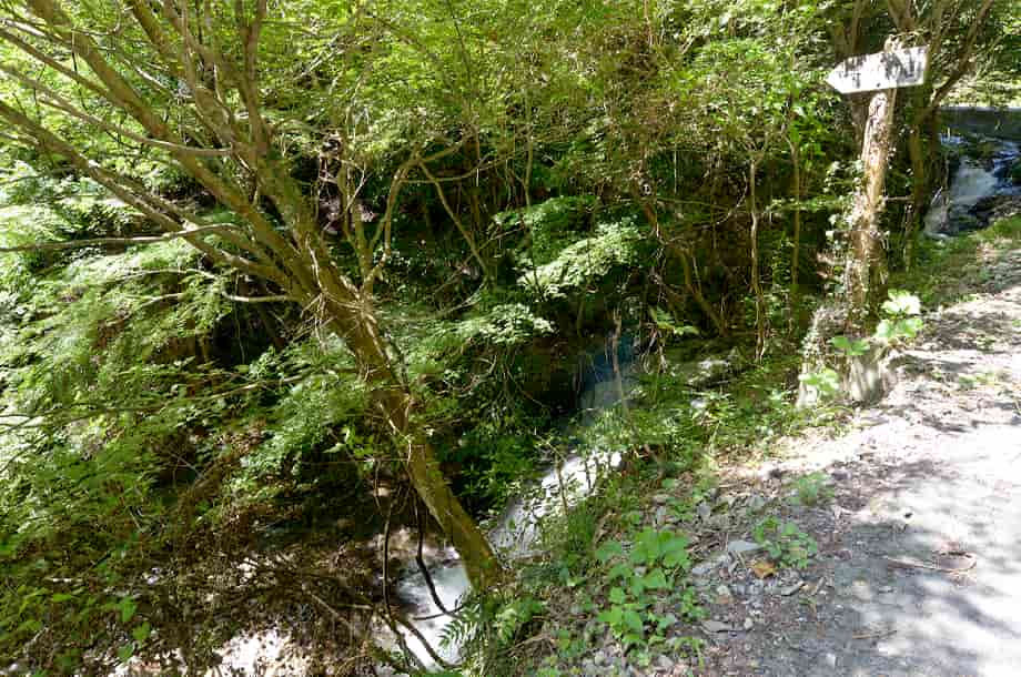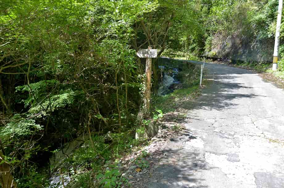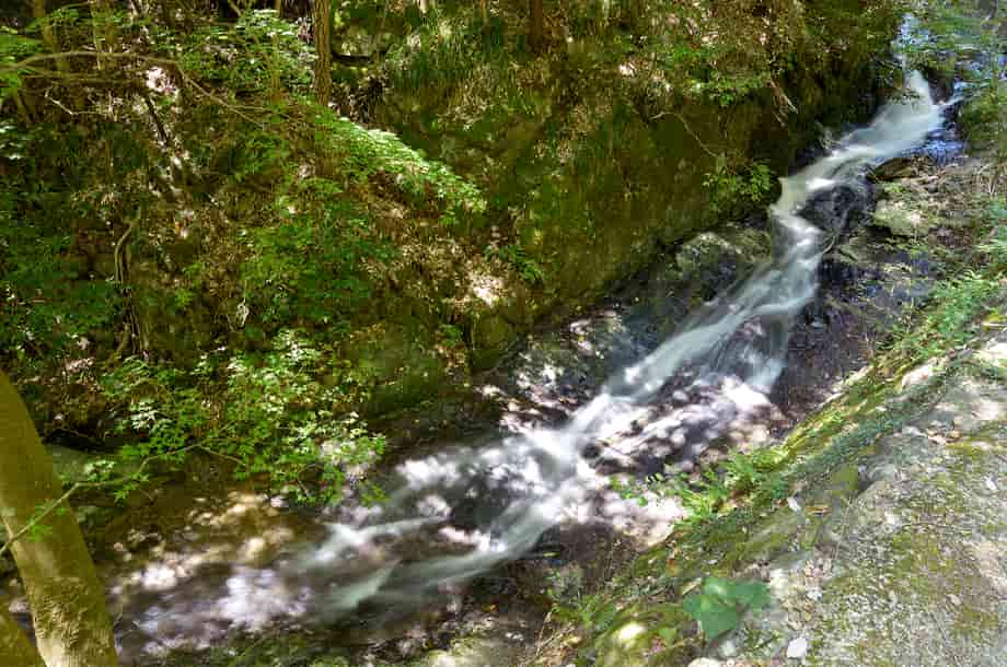 岡山県津山市にある「横野滝」は、上横野地区を流れる横野川に流れ落ちている。 この名前は、横野川にある三つの滝の総称で、下流側から「一の滝」、「二の滝」、「三の滝」と、やや離れて流れ落ちている。 この一の滝は、落差8m程と言われていて、道路際に流れ落ちているが、樹木に隠れてしまうので、全体の様子は分かりづらい。 また、見下ろすようにもなるので、それほどの落差は感じられないが、滝下から見ると、随分違った印象を受けるのだろう。 無理をすれば、急な斜面を降りて沢に行くこともできそうだが、その時にはロープなどを用意しておいた方が良さそうではある。 しかし、落ち口から上流側の景観は開けていて、半ば滑滝のような流れが続いている。 道路側は護岸されているが、その景観は味わいがあり、それに続く一の滝の落差との対比もおもしろい。 ただ、じっくりと眺めてもみたいのだが、一の滝は道路脇にあるので、時折自動車も通ったりするので注意する必要がある。 横野滝・一の滝への交通・アクセス さて、一の滝への交通は「横野滝」のページで紹介しているが、この滝は道路際にあって、道から見下ろすようになる為、見落としやすいかもしれない。 滝のところには道路左に名板を兼ねた案内板が立てられているが、やや見づらく感じられるので、上横野の集落からはゆっくりと進むようにして、この案内板に注意するようにした方がよい。 自動車の場合だと、滝から少し進んだところが広くなっているので駐車することができなくもないが、左斜面は植林されているので、作業が行われているときには駐車位置などに注意する必要がある。 できれば、二の滝付近の駐車場まで500〜600m程なので、自動車はそちらに止めて、歩いて降りてきた方がよいようにも思う。 |