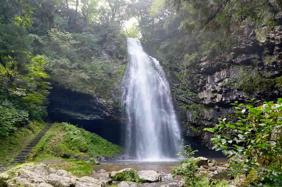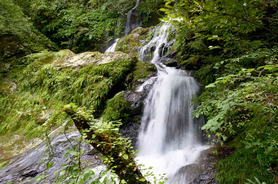 島根県雲南市にある「龍頭が滝」は、掛合町松笠地区を流れる滝谷川上流域に流れ落ちている。 雌雄ふたつの滝があるが、40m程の落差がある「雄滝」のことを「龍頭が滝」と呼ぶことも多い。 しかし、雌滝は落差20mと言われているが、雄滝に劣らずに素晴らしい。 遊歩道から見える限りでは、三段の段瀑になっているようで、落差も20mを超えているように思う。 上段部分は葉隠れしていてよくは見えないが、雌滝は奥行きのある滝で、雄滝とは違った味わいがある。 流れ落ちてきた水は広い沢筋へと向かい、広がりのある景観は心が晴れる。 雄滝から雌滝の脇を通る遊歩道が延びているが、遊歩道の途中からだと中段辺りの様子を窺うことができる。 ただ、この時は植物がよく繁茂していて、上段部分の様子は、下流側からしか見ることができなかった。 それでも、奥行きのある伸びやかな雌滝の様子は素晴らしく、雄滝と共に心に残る。 周辺もよく整備されていて清々しく、雄滝と共に気持ちのよい散策を楽しむことができる。 ところで、駐車場のところにある説明版によると、龍頭が滝には名馬・池月にまつわる伝説が伝えられている。 池月は鎌倉幕府を開いた源頼朝の秘蔵名馬で、源平合戦の宇治川の先陣争いにも登場している。 説明版によると「病によって母馬を亡くした仔馬(池月)は、来る日も来る日も悲しみに暮れ、滝の周りをさまよっていた。 ある日、ふと滝壺を覗き込んだとき、その中に母馬の姿を見た。 それは自分が水に映ったものだったが、愛しさのあまり水の中に飛び込み、その姿を追い続けた。 やがて、仔馬の泳ぎもすこぶる上達して、後の名馬となった」と、概ねそのように記されている。 龍頭が滝 (雌滝)への交通・アクセス さて、龍頭の滝への交通は「龍頭の滝・雄滝」で紹介しているが、雌滝へは、駐車場から歩いて来ると、遊歩道入り口に橋が架かっていて、そこに案内標識が立てられている。 橋を渡って右へ行くと雄滝、橋を渡らずに進んで行くと雌滝で、雌滝までは僅か40m程しかない。 案内標識から少し先に広場があり、ベンチも設置されているが、この辺りから雌滝を見ることができる。 また、先へ雄滝へ向かっても、脇道から雌滝の横を通るように遊歩道が伸びて、そちらからでも眺めることができる。 途中には雌滝の名板も立てられていて、遊歩道入り口の橋まで周遊するようになっている。 |