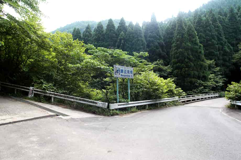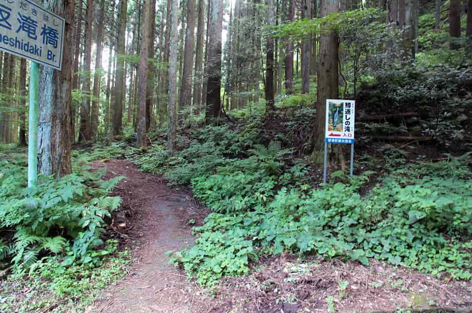 | ▲近くにある「鱒返滝橋」 | ▲鮎返しの滝への入り口 |