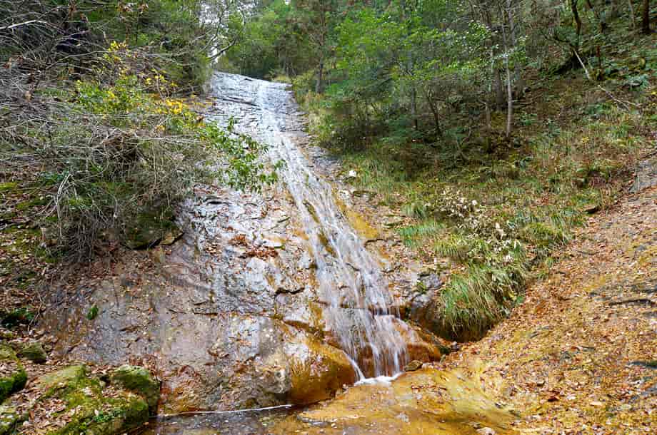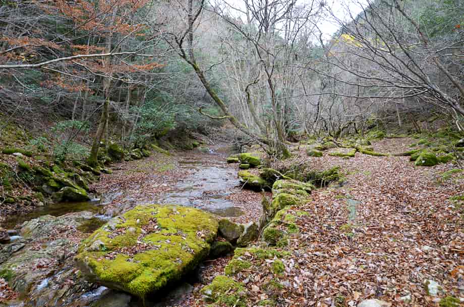 | ▲山道と法道寺川の様子 | ▲枝沢との分岐の様子 |