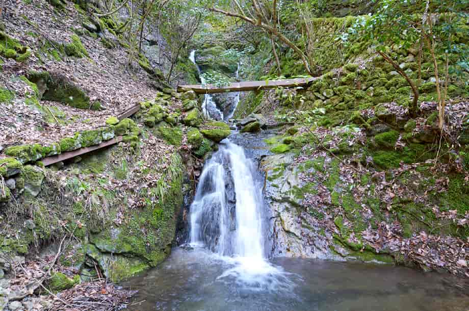 | ▲渓流の様子 | ▲ふたつ目の橋から先の山道の様子(ここを登り切ると不動滝が目に入る) |