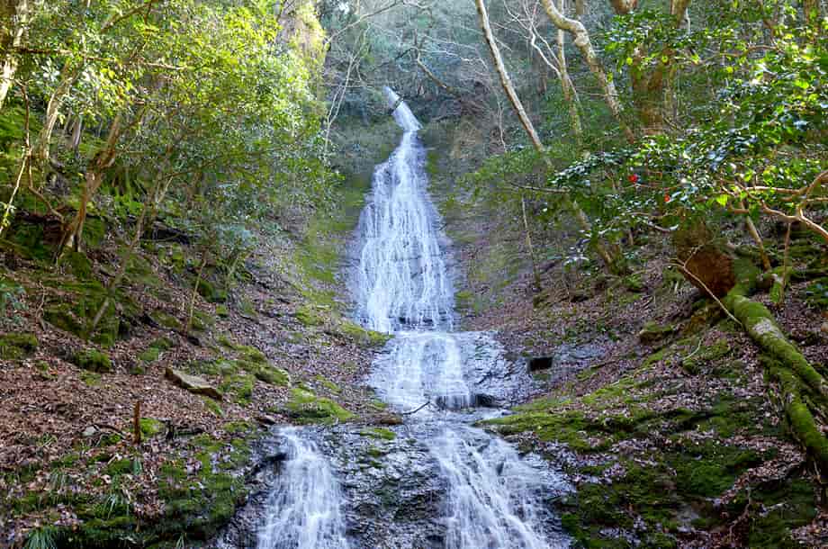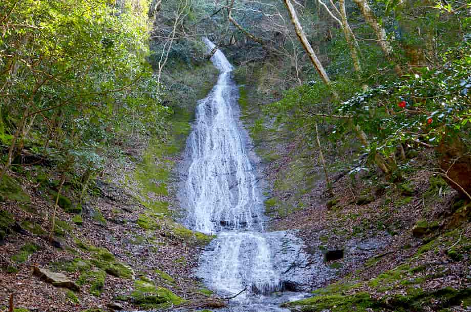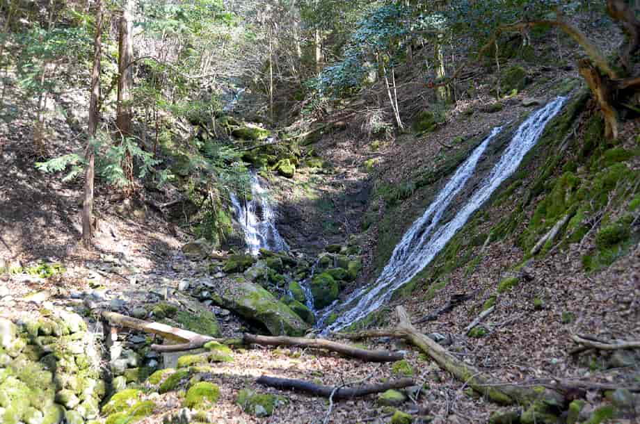 兵庫県朝来市にある「岩津不動滝」は、岩津地区を流れる観音川の上流部に流れ落ちている。 雌雄ふたつの滝からなっていて、雄滝の落差は50m程、雌滝の落差は20〜25m程だろうか。 いずれの滝も素晴らしく、山道を登って来てこの滝を見ると、ひと目で不動滝であることが分かる。 山道を登ってくると、先の方に雌滝が流れ落ちているので、まずそれが目に留まる。 同時に雄滝の下段部分も見えるが、これは下段部分を横から眺めていることになる。 滝前に近づき、右手を見ると、大きな岩肌を流れ落ちる雄滝全体が目に入るが、この時の光景には感嘆する。 落差だけでなく奥行きのある滝でもあり、布滝として流れ落ちてくる景観には驚かされる。 全体は三段の段瀑のようだが、末広がりになって流れ落ちる水の様子は美しく、強く印象に残る。 落差も50mを超しているのではないかと思うほどで、眺めていて飽きることがない。 この雄滝だけでも、ここまで登ってきた甲斐があるのだが、横には雌滝も眺めることができる。 雌滝は雄滝の左に流れ落ちているが、こちらも段瀑か連滝のようになっている。 上段部分の様子は分かりづらいが、見える範囲では20〜25m程の落差はあるだろう。 残念ながら、中段部分辺りには倒木があるが、雄滝とは違った流れをつくり出していて、味わいのある滝である。 この雌滝も、ほかの谷に流れ落ちていれば名前が付けられていてもおかしくはないが、雌雄両滝を一望できる岩津不動滝の滝は強く心に残る。 また、雌雄ふたつの滝の流れは滝下でひとつとなり、やがて観音川となって流れていくが、滝前に至るまでの渓流の様子も素晴らしい。 ここに来るまでらも幾つかの滝があるが、足を止めるものも少なくない。 山道の途中に架かる橋の所にも二段の段漠があるが、10mほどの落差はあるだろうか。 橋が滝前を横切っているのは少し残念だが、それでも目に留まる味わいのある滝ではある。 徳島県の神山町にある「雨乞の滝」なども雌雄ふたつの滝があり、まず雄滝が目に入り、滝へ近づくと右手に雌滝も見えるようになり、その景観に感嘆するが、この岩津不動滝も素晴らしく、実に見事な景観をつくり出している。 ところで、両滝の滝下にあたるところには、石の基盤のようなものが見られるが、ここには、以前に不動尊を祀る祠が建てられていた。 現在は、管理の都合上、ここに来るまでの獣除けゲートから100m程のところに移転されて祀られている。 この現在の祠の上流側にも味わいのある小滝が流れ落ちていて、祠を安置するにも相応しい場所のように感じられる。 また、雄滝の中段部分、右の岩肌にも石仏が安置されていた洞があるが、この石仏も移されたようにみえる。 いずれにしても、不動尊がいつの頃に祀られたのか、また、その所縁はどういったものかなども分からないが、この滝が信仰の対象でもあることは、推し量らずとも理解できる。 岩津不動滝への交通・アクセス さて、岩津不動滝へは、岩津地区にある鷲原寺を目指せば分かりやすい。 自動車の場合、播但連絡道路(播但道)の生野インターや生野北インターからだと、インターを降りてからすぐの国道312号線に入って、「和田山」方面へ向かって北上する。 2〜3分程も走ると、道路左側に「岩屋観音・鷲原寺 →」の案内標識が立てられている。 ここを右折するが、分岐の右手前の角には「鷲原寺・観音参道口」の大きな石柱も建てられている。 但し、この石柱は反対方向からだとよく見えるが、インターから来ると奥まっていて見えづらく、信号機などもないので、道路左の標識には注意する。 後はそのまま進んで行くと、左に鷲原寺があり、右は広い公園になっていて、駐車場などもある。 ここまで、生野インター辺りから10分程度。 岩津不動滝へは、ここを過ぎて少し行くと獣除けのゲートがあるので、それを開けて先に進む。 すぐに分岐があるが、左へ向かうと鷲原寺の奥の院へ向かうので、ここは道なりに直進する。 (奥の院の観音堂は素晴らしく、「岩屋観音の滝」や「手水の滝」などがあるので、時間があれば寄ってみるとよい) ほどなく駐車場となっている広場に着くので、自動車はここに止めることができる。 付近にはベンチやトイレもあり、周辺はハイキングコースのようにもなっている。 また、山門のようなものがあり、そちらも登山道になっているが、少し先には休憩所のような小屋が建てられている。 その小屋の辺りから先には進んでいないので、この道がどこへ続いているのかは分からないが、広場にある「水源かん養保安林」の案内図よれば、どうも鷲原寺の奥の院に続いているようなので、かつてはここから奥の院へ向かって登って行ったのかもしれない。 岩津不動滝へは、この山門をくぐらず、ベンチが設置されている道の方へと進んで行くが、道はよく整備されている。 ずっと上り坂だが、右手には渓流が流れ、途中の橋を渡ると、今度は左手に流れるようになる。