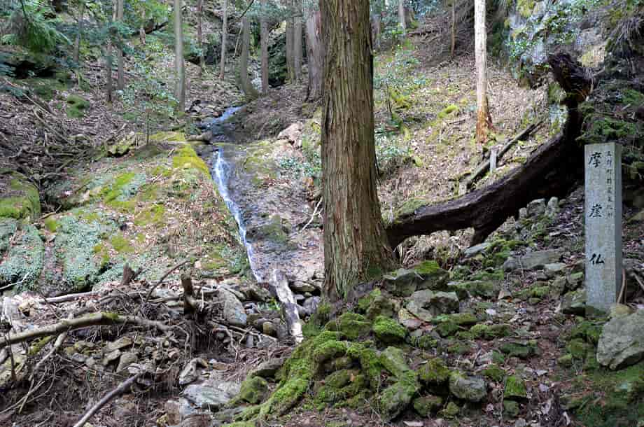 兵庫県朝来市にある「摩崖仏の滝」は、生野町口銀谷地区を流れる市川の枝沢に流れ落ちている。 落差5m程の小さな滝だが、浅いながらもはっきりとした滝壺をもっている。 名前のように、滝の向い辺りの岩には摩崖仏が彫られているが、周辺は閑静で、落ち着きある雰囲気が感じられる。 水は大きな岩肌をひと筋になって流れ落ちているが、この岩は中程で断層のようになっていておもしろい。 これは水の流れによって削られていったのだろうが、水量が多いと、岩肌全体を覆い隠すほどの、幅広い流れを現わすのだろうか。 ところで、摩崖仏の滝へは、国道付近にある山神社からの山道を歩いて行くが、山道の入り口には「摩崖仏」の説明板が立てられている。 それによると、この摩崖仏は大日如来像で、朝来市の指定文化財になっているが、彫られたのは室町時代末期(1570年頃)と記されている。 随分と古いものだが、当時、周辺はかなり山深いところであったろうから、一帯は行場のようになっていたのかもしれない。 付近には落差30m程の「不動滝」もあることから、ここに大日如来像が彫られたことも頷くことができるように思う。 恐らくは、この滝も信仰の対象になっているのだろう。 摩崖仏の滝への交通・アクセス さて、摩崖仏の滝は下流側の山神社から上ってくることになるが、山神社までの交通は山神不動滝のページで紹介しているので、山神社の横から延びる山道を歩いて行けば、入り口から10分ほどで滝前に着く。 山道ははっきりとしていて歩きやすく、摩崖仏のところには石柱があり、滝はその向かいの斜面から流れ落ちている。 |