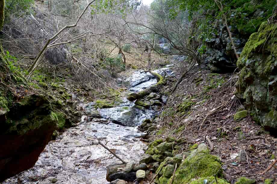 | ▲大きな岩の分岐から降りた所にある樹木のある岩・下段の滝へは右(左岸)から上がっていく | ▲下段への右岸の山道・途中で進めなくなった |