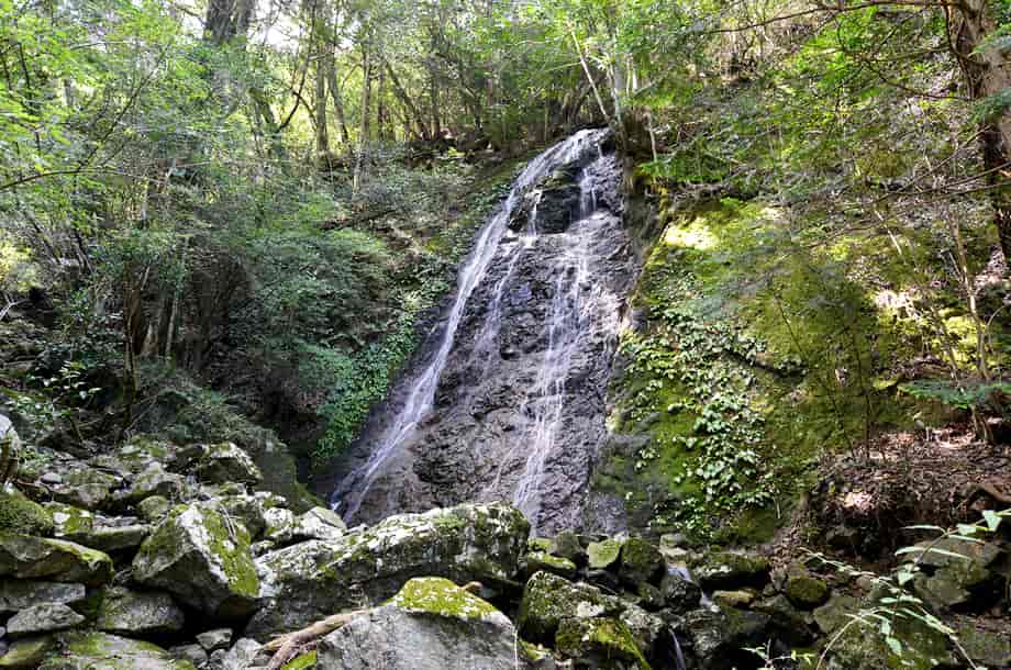 兵庫県福崎町にある「七種の滝」は、田口地区を流れる七種川にある滝の総称で、七種山を源としている。 この「雄滝」は、七種の滝の中でも最たるもので、この雄滝のことを「七種の滝」と呼ぶことも多い。 雄滝の落差は70m程とされていて、ひと目見ると強く心に残る。 滝下からだと、実に見上げる程の高さがある岩肌を水が流れ落ちている。 この流れは、大きな甌穴のようにも見える岩の窪みを通り、段漠のように続いている。 この大きな窪みのある岩肌が雄滝を特徴づけてもいるが、全体の様子も素晴らしい。 養父市にある「天滝」や宍粟市の「原不動滝」などに比べると、落差こそ及ばないものの、雄滝には違った趣があり、実に印象に残る。 水量が多いとどのような姿を現すのか思いもつかないが、さぞかし壮大な景観を現わすのだろう。 下流側にある「虹ヶ滝」、「八龍滝」も味わいのある滝だが、雄滝を見た時には、やはり感嘆する。 滝見台ともなる七種神社から眺めるのもよいが、滝下辺りに腰を下ろし眺めていると、その堂々とした力強さに、しばし時を忘れてしまう。 雄滝への交通・アクセス さて、七種の滝までの交通は、そのページで紹介しているので、雄滝は作門寺の駐車場から七種神社の鳥居を潜り、そのまま山道を登っていけば、山門から25分もあれば滝下に着く。 鳥居からは「虹ヶ滝」、「八龍滝」と続いているが、鳥居からだと10分程で雄滝に着く。 滝下へは、八龍滝から山道を登って行くと、途中の階段となる手前辺りに左への脇道が延びている。 そこを入って行くと、すぐに雄滝が目に飛び込んでくるが、この時の光景は強く印象に残る。 滝下周辺は岩が多くて平坦な所はないが、雄滝の全景を見ることができるほどの広さは開けている。 また、山道を更に登って行くと、急な石段を登り切ったところに七種神社がある。 ここは滝見台にもなっていて、ここから見る雄滝も素晴らしい。 樹木などが茂っているとやや見えづらいが、それでも堂々した様子は印象に残る。 |