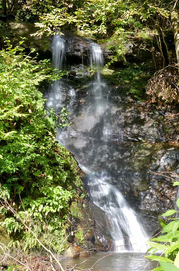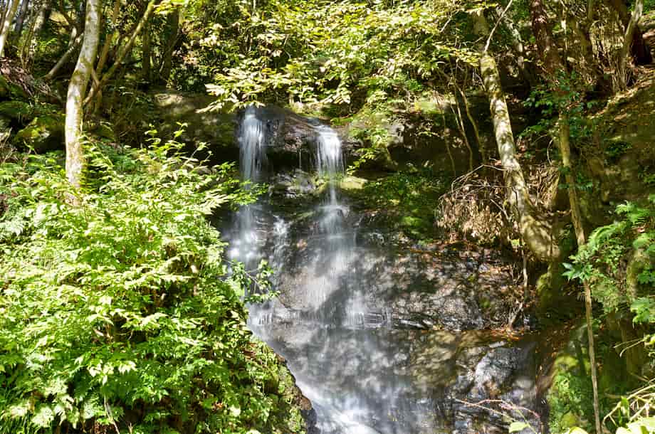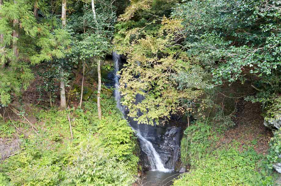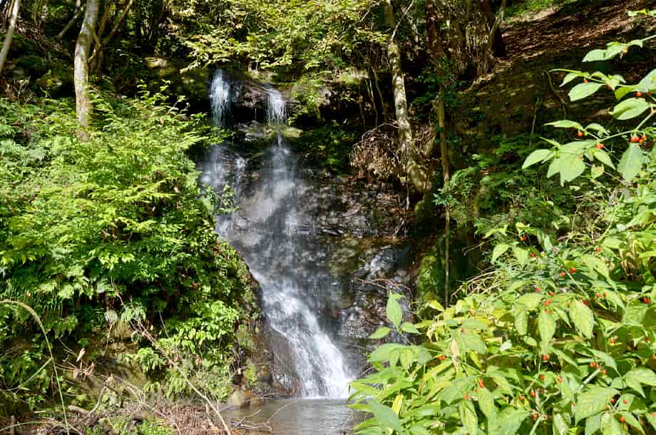 兵庫県香美町にある「用野の滝」は、村岡区用野地区を流れる湯舟川の枝沢にある。 やや奥まってはいるが、道路から見ることのできる滝で、10m程の落差があるだろうか。 半ば葉隠れしているので見えづらいが、水はふた筋になって流れ落ち、下方部分でひとつになっている。 大きな滝ではないが、その様子には味わいがあり、小さいながらも滝壺も見られる。 滝下へ行くと落ち口の様子も見ることができるが、滝の手前はやや荒れている。 滝壺からの流れは、道路下の大きな導水管を通って下流へと流れているので、反対側の景観はよいとは言えない。 しかし、用野の滝自体は味わいのある滝で、周辺が開けていれば、結構見応えする滝であるように思える。 用野の滝への交通・アクセス さて、用野の滝へは、自動車の場合、香美町内の国道9号線を北へ進むと、「出石・豊岡」方面へ向かう国道482号線との分岐がある「村岡地域局前」の交差点がある。 この交差点をそのまま国道9号線へと進むと、1.5km程で全但バスの「用野」バス停があり、そこから右への脇道が延びている。 この分岐には信号機などはないが、「用野」のバス停は国道が大きく右へ曲がり切った辺りになり、右側のバス停にはブロック造りの待合所も建てられている。 また、ここから先には「村岡トンネル」が見えるので、それにも注意するとよい。 右への脇道は上り坂になっているが、そのまま上って行くと、道は右へと曲がるようになり、用野の滝は、その曲がる途中に流れ落ちている。 やや奥まっているので見えづらいが、道路からでも見ることができる。 「村岡地域局前」の交差点からだと3~4分程で、脇道に入ってからだと、僅か150m程度の距離にある。 自動車は、滝の手前がやや広くなっているので止めることができるが、カーブにもなっているので、駐車位置には注意する必要がある。 滝は道路から眺めることができるが、右側の斜面を降りて行けば、滝下へ行くことができる。 ただ、斜面はやや急で、植物が繁茂していると、僅かな距離だが降りづらく、滝下へ降りても場所が限られてしまい、滝の正面へ行くのは難しい。 また、この時の水量は程よく思えたが、水量が多いと、長靴などを用意しておいてもよいかもしれない。 |