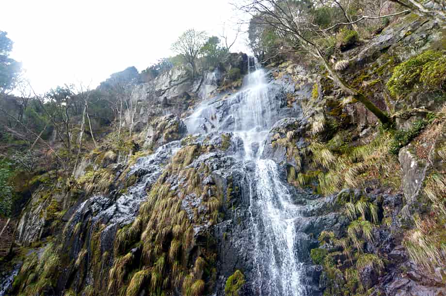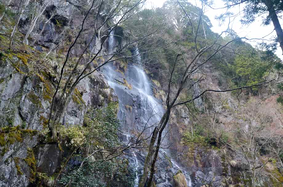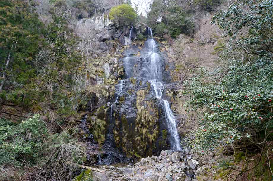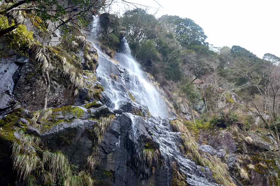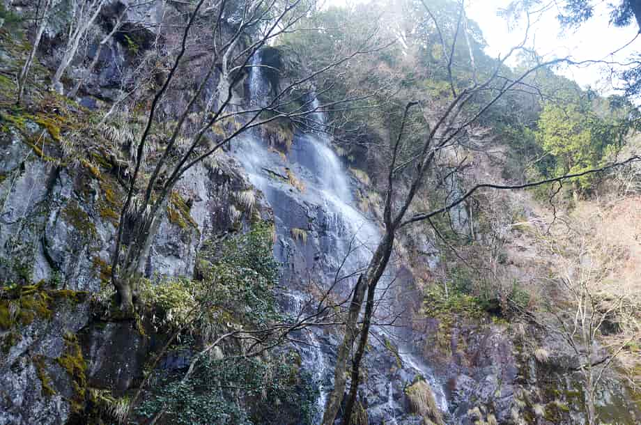 兵庫県神河町にある「足尾の滝」は、長谷地区を流れる犬見川の枝沢に流れ落ちている。 落差30m程の大きな滝で、枝沢にある滝とは言え、幅広い岩肌を水が流れ落ちる様子は素晴らしい。 神河町には「扁妙の滝」をはじめ、「水ヶ野の滝」や「千檀の滝」、「黒岩の滝」など、素晴らしい滝がいくつかあるが、この足尾の滝も印象に残る。 山道を歩いてきてこの滝が目に入った時には、少なからず感嘆する。 辺りも開けているので清々しく、滝前に立つと、その大きさに見入ってしまう。 落差だけなら同じ程度の滝がいくつもあるが、足尾の滝は周辺の様子も相まって、心に残る滝でもある。 この時の水量は少ない方だと思うが、より水量があれば、どれほどの様子を現わすのだろう。 落差も30mを超えているのではないかと思うが、実に堂々とした感じを受ける。 また、この上流には「中の滝」、「上の滝」と、これもまた見応えのする滝が流れ落ちていて、本滝と共に「足尾三滝」とも呼ばれている。 特に、上の滝は本滝に劣らず素晴らしく、本滝の滝前に架かる橋を渡ると山道が続いていて、上の滝まで問題なく登って行くことができる。 途中の山道から見る足尾の滝は、より落差が感じられるほか、山道を進むと「天狗のとまり木」と呼ばれる千年桧などもあり、足尾の滝は見どころの多い滝でもある。 足尾の滝への交通・アクセス さて、足尾の滝へは、長谷地区にある長谷ダムなどを目指すと分かりやすい。 自動車の場合、播但連絡道路(播但道)・神崎南インターからだと、インターを降りてからすぐにある県道8号線を宍粟方面へ向かって西へ進む。 しばらく行くと市川を越えて、その先にあるJRの踏切も越える。 踏切の先は突き当りになっているので、この分岐を右折する。 右折した道は県道404号線なので、しばらくは、そのまま道なりに進んで行く。 やがて犬見川を越えた先に「← 宍粟 県道39号線/長谷駅 県道213号線 →」などと書かれた道路案内標識があるので、その先の交差点を左折する。 交差点の右奥には「← 砥峰高原11km・長谷ダム3km」の案内標識も立てられているので、それにも注意するとよい。 左折してから600〜700m程進むと、道路右に「洞嶺山・祐泉寺」と刻まれた大きな石柱があるので、この分岐を右へ入っていく。 右へ曲がってから注意して走っていくと、700〜800m程で道路右側に「登山口・足尾の滝 約1.7km →」と書かれた案内板がある。 ここまで、神崎南インターから20〜25分程度で、案内板のところはゲートになっているが、普段は閉まっているようなので、これを開けて林道を登って行く。 (この時はゲートから道路を挟んだところに駐車場への案内板があるので、この時はそちらの駐車場に自動車を止めた) 林道と言ってもよく舗装されている道で、自動車でも問題なく登って行くことができる。 ゲートから500m程進んだところに駐車場があるので、自動車はここに止めることになるが、付近には案内板があり、足尾の滝は、ここから1.2km程の距離にある。 自動車を置いて林道を登って行くと、滝へと向かう分岐がある。 ここには説明書きを兼ねた案内板が立てられているので、見落とすことはないと思う。 案内板のところからは所謂山道になるが、木組みの階段なども設置されているので、すぐに分かる。 ただ、この時は、この案内板のところから山道へ入っていったが、ここから先へも道を延ばす工事がされていたので、現在は案内板から先へも進むことができるはずで、その場合は、滝までもずっと近くなっていることと思う。 ところで、案内板からの山道は整備されていて、はっきりしているのだが、この時は工事に伴うためだろう、途中に大きな間伐材が何本か横たわっていて、これを越すのに苦労した。 滝前まで、案内板のある分岐から15分程度の距離だと聞いていたが、この時はこの間伐材を越すこともあって、30分ほどの時間がかかっている。 しかし、山道の脇にも間伐された多くの樹木が、半ば倒木のように横たわっていて、一部に倒木などもあるが、全体としては歩きやすい方だと思う。 倒木のような間伐材を過ぎると、またはっきりとした山道が続いているが、そのまま進んで行くと、途中に注連縄が巻かれた大きな岩がある。 脇には小さな祠もあるので、山の神なのだろうか。 詳しいことは分からないが、何か所縁のあることなのだろう。 ここから更に進むと、やがて足尾の滝を遠望することができる。 滝が見えた時には少なからず驚きがあるが、開けた滝前に近づくと、思っていた以上に大きな滝であることが分かる。 尚、案内板のある分岐から先の工事が終わっていれば、付近に駐車場も造られているかもしれず、滝への距離も短くなっていることと思う。 また、案内板からの山道に横たわっている間伐材なども取り払われていれば、山道もはっきりとしているので、そのまま進んで行けば15〜20分程で滝前に着くとも思う。 |