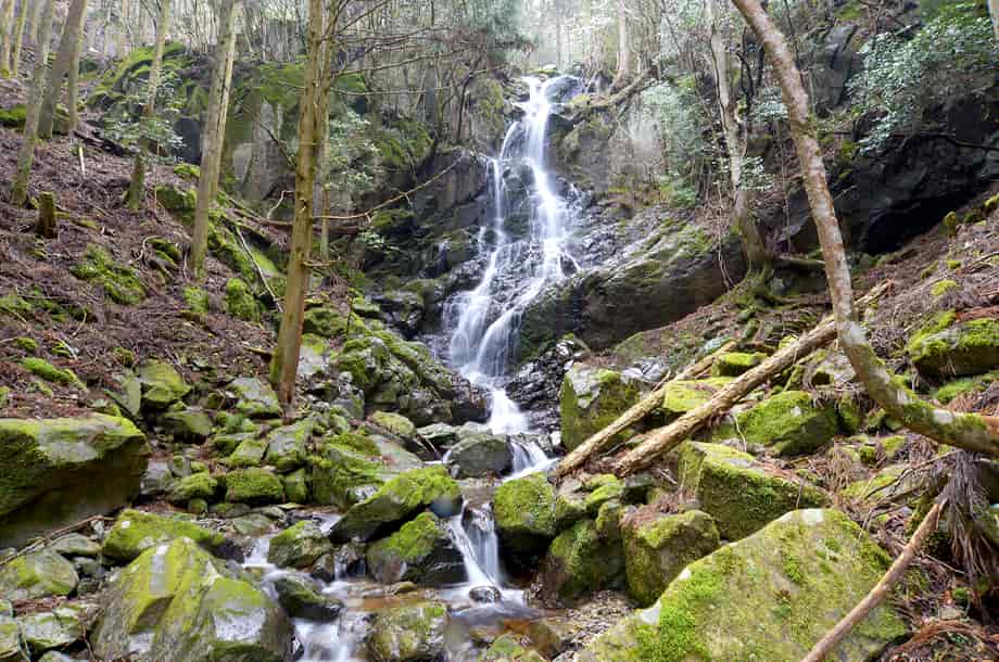 兵庫県神河町にある「足尾・中の滝」は、長谷地区を流れる犬見川の枝沢に流れ落ちている。 本滝である「足尾の滝」の上流側にあり、落ち口から少し先にある。 周りは開けていて清々しく、小さいながらも味わいがある。 落差は6〜7m程だろうか、大きくはないが、本滝とは違って幾段かの段瀑になっていて、水が流れ落ちる様子もおもしろい。 本滝の横の急な山道を登り切ると小さな丸太橋がふたつ架かっているが、その辺りから見える中の滝の様子も悪くない。 また、付近には「天狗のとまり木」と呼ばれる千年桧があり、大きな桧が目に入る。 ここには展望台も設けられているが、脇には祠も安置されていることから、この桧は、いつの頃からか信仰の対象にもなっているのだろう。 脇にある説明版によると、「皇極天皇(600年〜645年頃)の御代に蘇我入鹿に攻められた山背王(やましろおう・聖徳太子の子)は深山に住む天狗に身の安全守らすため、天狗庇護のもと大和を逃れて、越原真武長者を尋ねてきた。 山背王は天狗を当地深山にある風光明媚な滝の上に住まわせていたが、ある日、病にかかられ、やがて落命された。 山背王は落命される前に天狗を呼び、お前が住んでいる深山の中で香のよい木を探し、その木を住拠とし、この先、永久に当地の守り神として尽くすよう命令したと」とされている。 この木が「天狗のとまり木」と呼ばれる千年桧で、枝が四方に広がっている立派な古木である。 足尾・中の滝への交通・アクセス さて、足尾・中の滝は足尾の滝の上流側にあるが、そこまでの交通は「足尾の滝」のページで紹介しているので、足尾の滝からは、滝前にある木橋を渡ると、左の斜面に山道が延びている。 この山道を登って行くと、10〜15分程で滝前に着く。 山道は勾配があるが、はっきりとした道で、整備もよくされている。 勾配が強いのでつづら折りのようにして登って行くが、山道を登り切ると足尾の滝の落ち口になっている。 その先には小さな木橋が架かっているが、中の滝はこの近くに流れ落ちている。 更に上流へ向かうと「上の滝」があるが、中の滝の付近には千年檜の案内板が見え、大きな檜が目に入る。 立派な大木で古木でもあり、枝は四方に広がっていて見応えがする。 また、山道の途中で足尾の本滝を横から見ることができるが、その辺りから見る景観も素晴らしく、随分落差があることも分かる。 |