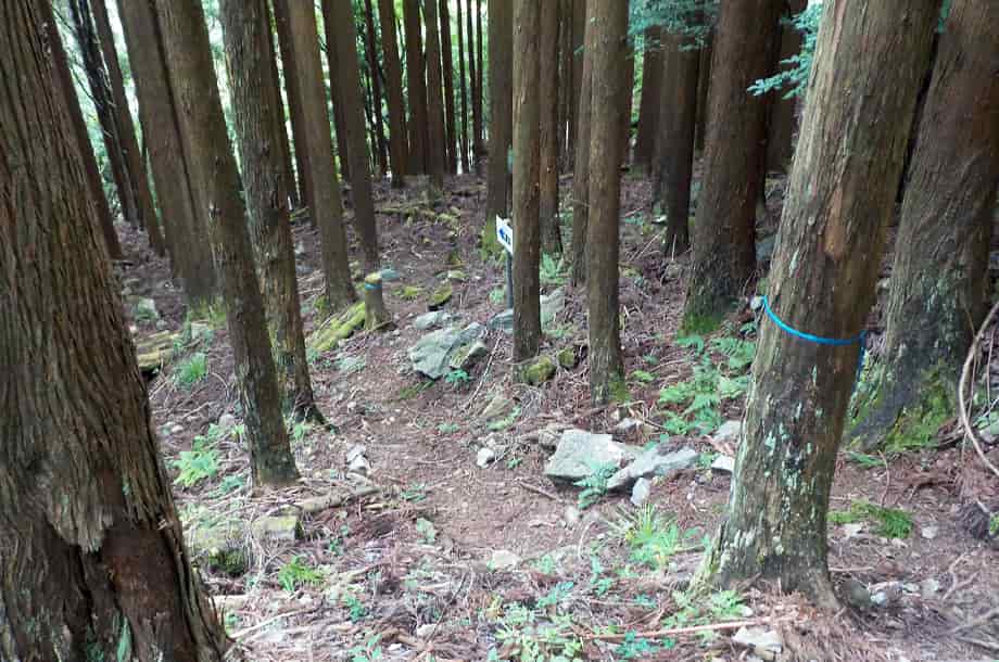 | ▲山道の様子・所々にテープの目印や案内板がある | ▲途中にある案内板 |