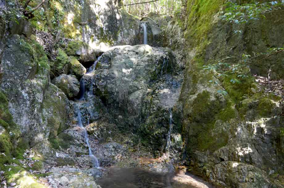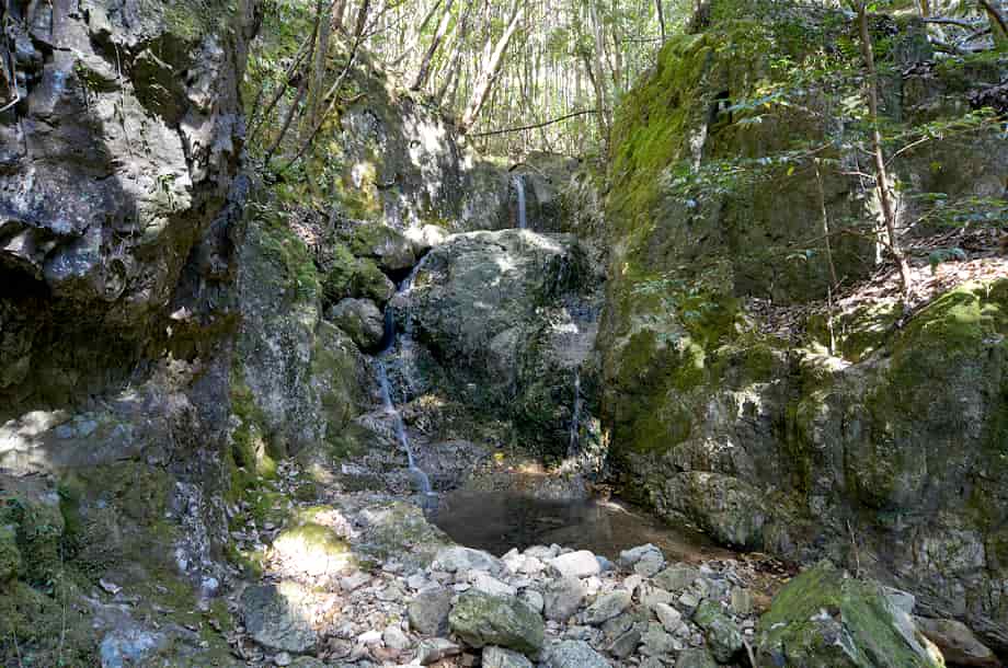 神河町寺前にある「大瀬の滝」は、小田原川に流れ込む支流の上流部に流れ落ちている。 この日は水量が少なかったようだが、落差8〜10m程の段瀑で、下段部分が二条になっているのが分かる。 これは岩肌の中程が突出しているためで、全体にゴツゴツとした荒い感じがしないでもない。 しかし、滝は奥まった所に流れ落ちているせいか、辺りは神聖な雰囲気が感じられる。 実際のところ、滝の右の岩肌には地蔵尊、左の岩肌には不動尊らしい石仏が安置されていて、この滝が信仰の対象になっていることが伺える。 滝前も開けていて、落ち着きのある空気が感じられる。 滝近くにある説明版によると、「最明寺参道の霊地として信仰の道場である」とされているので、大瀬の滝一帯は、山の裾野にある最明寺の奥の院になっているのかもしれない。 また、最明寺の開基にあたって、「行基菩薩御作の薬師如来が安置された」とも伝えられているので、滝右にある岩肌に安置されているのは薬師如来なのかもしれない。 林道終点から大瀬の滝までの間に二基の祠が建てられているが、ここはちょっとした広場になっているので、かつてここにはお堂などが建てられていたのだろうか。 この祠の土台も立派なもので、脇には常夜灯を模した石灯篭も設置されている。 現在は林道もよく整備されていて、堰堤も造られている。 また、滝の左上の斜面には作業林道も延びているが、かつては山深いところで、大瀬の滝一帯は信仰の道場に相応しい場所であったことが思われる。 大瀬の滝への交通・アクセス 大瀬の滝までは、付近にある最明寺か寺前小学校を目印にすればよいが、自動車の場合、播但連絡道路・神崎南インターからだと、インターを降りて県道8号線を「宍粟」方面へ向かって西へ進む。 道なりに走って行くと、市川を越えた先でJRの踏切を越えるので、踏切を越えた先の交差点を右折する。 この道は県道404号線になるが、曲がってから二つ目の交差点を左に曲がる。 この交差点には信号機などはないが、「寺前小学校」・「寺前幼稚園」などの標識が左角にあるので、それにも注意するとよい。 ここを左に曲がって進んで行くと、400〜500m程で寺前小学校が右手にあるので、学校を過ぎてから一つ目の交差点を右へ進む。 小学校の横にも学校に沿うように道があるが、その道ではなく、右折するところはその先の交差点で、曲がり角にはカーブミラーと道路両脇には電柱が立てられていて、右角はゴミ置き場が設置されている。 ここを右へ曲がるとすぐに分岐があるが、ここは右へと進む。 道はずっと上り坂で、曲がりながら続いているが、そのまま進めば林道入り口のゲートに着く。 ここまで、神崎南インターから7〜8分程で、あとはこのゲートを開けて林道を進んで行く。 しばらく行くと、左に大池が見える辺りで林道は終わりになるので、自動車は林道終点が広くなっているので駐車することができる。 また、ゲートからの林道はよく整備されているので、自動車でも問題なく走ることができる。 林道終点からは、駐車場の奥から左へと延びる山道があるので、そこから山道に入って行く。 山道に入ると、ほどなく右へ曲がらなければならないので、この分岐には注意する。 この分岐をそのまま進めば「中はりま森林組合」の標識があるので、そこまで来たら道は間違っている。 山道の分岐を右へ入ると、すぐに石の土台の上に立てられたふたつの祠が目に入る。 この奥に山道が続いているので、祠を右に見て進んで行くと、右の斜面下に堰堤が見える。 このすぐ先に、右に下っていく滝への道があるので、ここを右へ入る。 道は下りになっているが、この分岐には、樹木に赤い目印が巻かれているので、それに注意するとよい。 道を下るとすぐ沢に出るが、ここは先ほど山道から見えた堰堤の上になる。 堰堤は右に見えるが、沢向こうの正面辺りの樹木に赤いテープが巻かれていて、そちらが滝への山道となる。 沢を渡って山道を行くと、すぐに大瀬の滝の説明版があり、この辺りから滝が見える。 林道終点から滝までの道も歩きやすく、10分も歩けば滝前に着く。 |