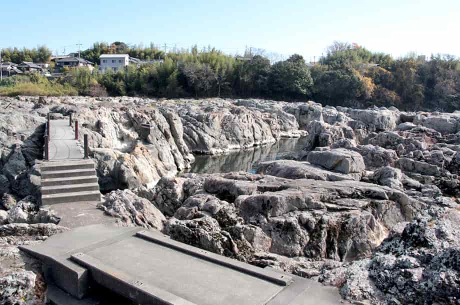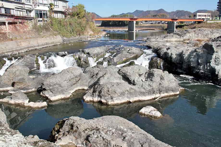 闘龍灘は、兵庫県加東市を流れる加古川の本流にある景勝地で、辺り一帯は奇岩が連続して起伏している。 この奇岩は川幅いっぱいに広がっているため、この辺りの流れは複雑で、激流や滝などをつくり出し、独特の景観をなしている。 「ひょうご景観ビューポイント150選」にも登録されていて、訪れる人も多いのか、周辺はよく整備されている。 この「闘龍灘の滝」は、落差3m程だが、幾筋もの流れになって、幅は25mほどはあると言われている。 右岸には公園が整備されていて、ここから一帯を眺めることができるが、奇岩で造られている中洲にも、公園からすぐに降りて渡ることができる。 中州に降りれば滝を間近に眺めることができるが、水量は豊富で、落差こそ小さいが、いっそう力強い感じがする。 中洲もよく整備されていて、散策するにはおもしろく、様々な水の流れや岩の様子を楽しむことができる。 特に、中洲の中程には運河のようになっている水道が目につくが、これは人工的に造られたもので、明治期に水運の利便のために造られている。 加古川は東播磨の重要な流れだが、かつては水運もよく栄え、多くの船が往来していた。 しかし、ここ闘龍灘は船では通ることができず、一度上流側、或いは下流側で荷を下ろし、再び下流側や上流側で荷を積み込んでいた。 これを解消するため、岩を削り、船が通れる水路が造られたのだが、この水路は、規模こそ小さいかもしれないが、どこか渓谷の様子を彷彿させる。 また、水運が栄えていた頃には、周辺の村などもよく栄えたと言われているが、公園付近の旧街道などを歩いてみると往時をしのぶことができる。 公園に隣接して観光用の無料駐車場が用意されているが、この少し下流が闘龍灘の終わりになっている。 闘龍灘は駐車場からでも眺めることができるが、この辺りの川岸にも簡単に降りることができるので、下流側からの眺めを楽しむのもよい。 ところで、幅のある滝の様子は、どこか三木市の「黒滝」を思い出させるが、幅は黒滝ほどでもないが(黒滝の幅は30m程度)、この闘龍灘の滝は辺りの景観と相まって、実におもしろい。 奇岩の規模も思っている以上に大きく、西にある五峰山の頂上付近にある光明寺の駐車場からでも遠望することができる。 ここから眺める闘龍灘は、名前のように、龍が躍動し、闘っているように見える。 闘龍灘の滝への交通・アクセス さて、闘龍灘の滝へは、自動車の場合、中国縦貫自動車道・滝野社インターからだと、インターを降りて国道175号線を西脇方面へ進む。 しばらく進むと「闘龍灘東」の交差点があるので、ここを左折する。 左折してから少し行くと加古川を渡るようになり、この辺りから左手に闘龍灘が見えので、橋を越えた少し先の分岐を左へ入る。 この交差点には目印などがないが、すぐ先に信号機のある「滝」の交差点が見えているので、その手前を左へ入る。 左折した道は細くなるが、少し行くと左に滝公園があり、そのすぐ先を左へ入ると、河川際の駐車場に着く。 ここまで、インターから10分もかからず、公園の先にも第二駐車場がある。 駐車場は加古川沿いにあるので、滝は少し上流側の公園付近から近くに行くことができる。 また、光明寺は、新緑や紅葉の名所として知られているが、辺りは正平6年/観応2年(1351年)の足利尊氏・高師直の軍と、足利直義・石塔頼房などの軍との間で起こった合戦・光明寺合戦の場としても知られている。 自動車なら、闘龍灘公園の駐車場から光明寺の駐車場まで10分もあれば着くので、闘龍灘を散策したのち、訪れてみるのもよいかもしれない。 |