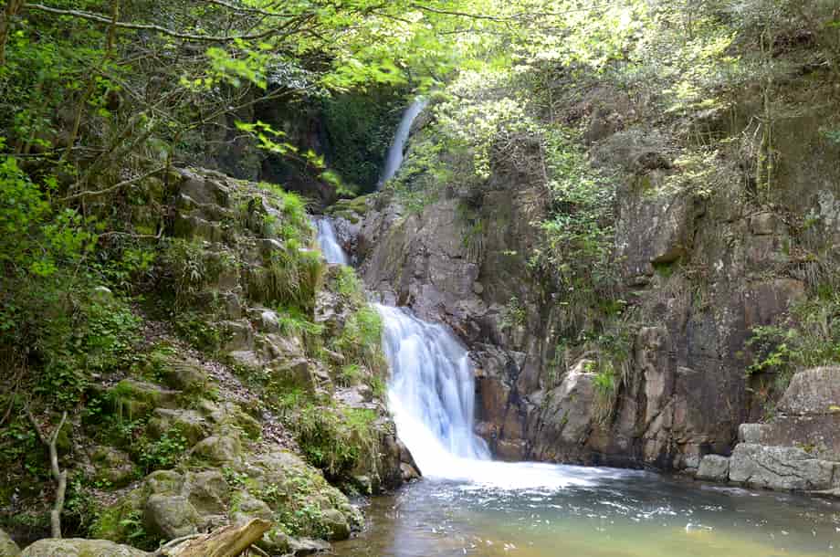 兵庫県神戸市北区にある「鍋谷の滝」は、有野地区を流れる奥山川に流れ落ちている。 全体は三段のはっきりとした段瀑で、上段の滝は落差7〜8mほど、中段と下段は、それぞれ4〜5m程だろうか。 滝前が開けているので見応えする滝で、水が流れ落ちる様子も変化があっておもしろい。 だが、残念ながら全体の姿を見るのは難しい。 やや左側から眺めると、僅かに全体の様子を伺うことができるが、正面からだと中・下段の滝しか見ることができない。 しかし、滝の左にある岩を登れば、上段と中段の滝を近くで見ることができる。 下段の滝は落ち口しか見えないが、ここから見ると思った以上に迫力があり、鍋谷の滝が大きな滝であることが分かる。 ただ、足元には注意しなければならないが、この岩は見た感じよりも登りやすい。 ところで、周辺は逢山峡と呼ばれる景勝地で、訪れる人も多い。 住宅地の近くなので、地元の方が散歩をしている姿もよく見かけるが、初めて訪れると、住宅地の近くにこのような渓谷があるのかと少しばかり驚きがある。 遊歩道も舗装されていて歩きやすく、途中からは奥山川の支流沿いに渓流が続いている。 この支流の上流部に行けば「不動滝」や「猪ノ鼻滝」なども流れ落ちているが、更に進むと広場もあるので、その辺りまで散策してみるのもよい。 散策路はよく整備されているので、広場まででも問題なく歩くことができる。 鍋谷の滝への交通・アクセス さて、鍋谷の滝へは、まず逢山峡の入り口を目指すことになるが、逢山峡の入り口は奥山川を渡る合ノ本橋の袂になり、六甲森林線の起点にもなっている。 逢山峡の入り口付近に駐車できなくもないが、作業車や公用車の出入りもあるので、できれば自動車の利用はやめた方がよい。 最寄りの駅は神戸電鉄・唐櫃台駅か有馬口になるが、逢山峡の入り口まで、唐櫃台駅から徒歩で18〜20分程度、有馬口駅からだと15分程度なので、自動車の場合は駅付近の駐車場を利用し、そこから歩いて行っても遠すぎる距離ではない。 ただ、逢山峡の入り口までは、どちらの駅からでも住宅街を抜けていくので、詳細は記述しづらい。 簡単に紹介すれば、有馬口駅からだと、駅の北側にある駐輪場の横の道を、そのまま道なりに南へ歩いて行けば、逢山峡の入り口になる合ノ本橋に着く。 また、合ノ本橋の上には、ちょうど阪神高速・北神戸線が通っている。 阪神高速はかなり高いところを通っていて、離れていても目に留まるので、この阪神高速の高架も目印にすれば分かりやすい。 合ノ本橋のところからは、奥山川沿いに遊歩道が延びているが、六甲森林線の起点でもあり、ここからも舗装された道が続いている。 道は歩きやすく、沢を右手に見ながら歩いていくと、途中で右に橋が架かっているところがある。 ここは曲がらずにまっすぐに進み、少しばかり行くと道が分岐しているので、ここは右の道に進む。 右に逸れるとすぐにポンプ場があるので、その建物の辺りから沢へ降りる。 沢への道ははっきりとはしないが、よく見ると踏みあと程度だが道があるので、そこを下っていくとよい。 但し、草木が繁茂している時期は分かりづらいかもしれない。 沢まではすぐで、右手で川が合流しているのが分かる。 左の奥にはダムが見えるが、右手に見える川が奥山川なので、そちらへ進むと小さな渓流滝があり、その奥に鍋谷の滝が流れ落ちている。 沢に降りてからだと5分もかからないが、渡渉しなければならないので、長靴などを用意しておいてもよいかもしれない。 岩伝いに川を渡ることもできるが、水量が多い時などは、やはり長靴などがあった方がいい。 また、よく見ると対岸の木に赤いテープが巻かれているので、渡渉するときの目印にすればよい。 滝前はゆっくりと腰を下ろせる場所は少ないが、滝壺も広く、眺めていても清々しい。 |