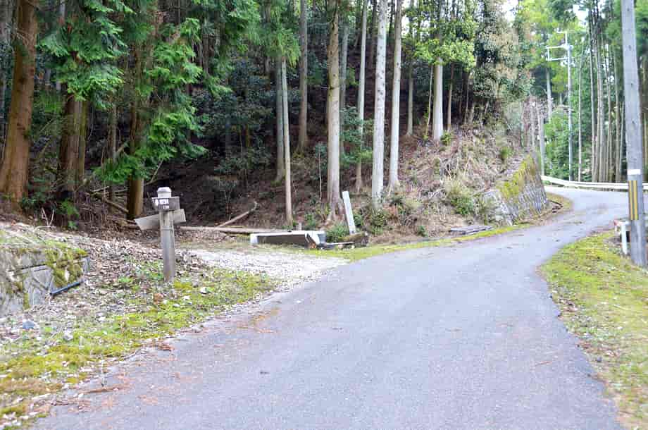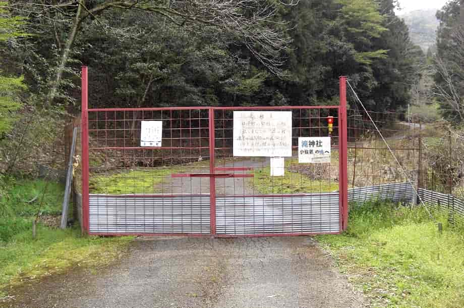 | ▲林道途中の分岐・右に案内標識がある(ここを左へ行くと滝神社への山道になる) | ▲山道手前にある車止め |