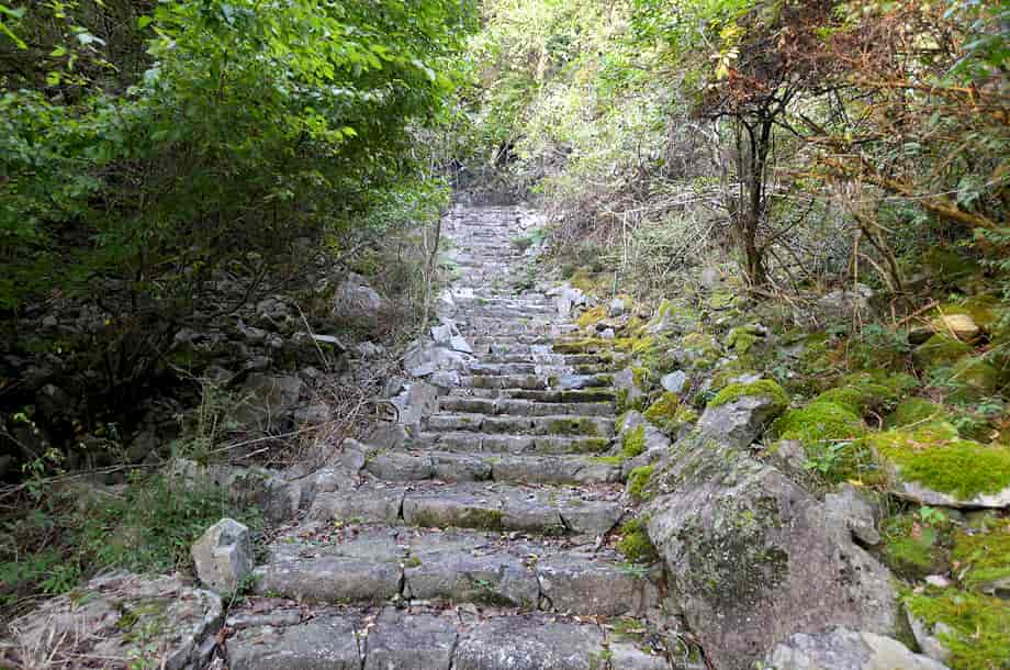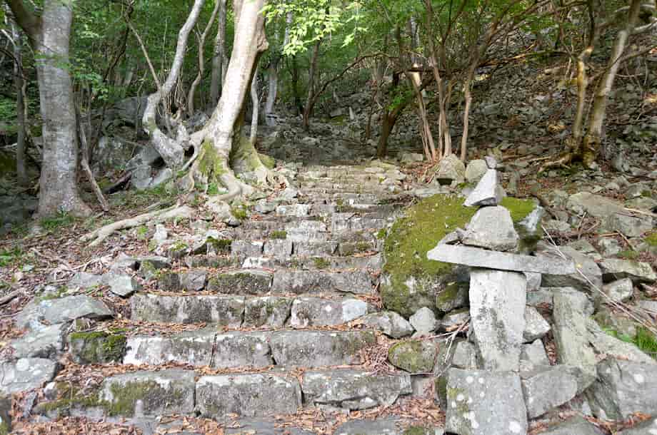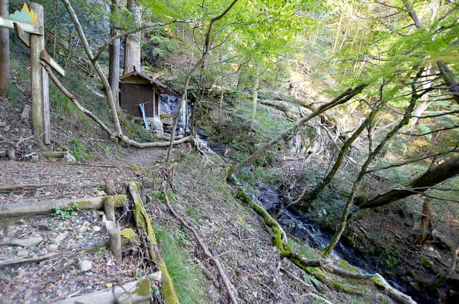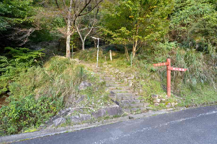 | ▲遊歩道の入り口の様子・標柱には「白龍の滝」と書かれている | ▲入り口付近の石段 |