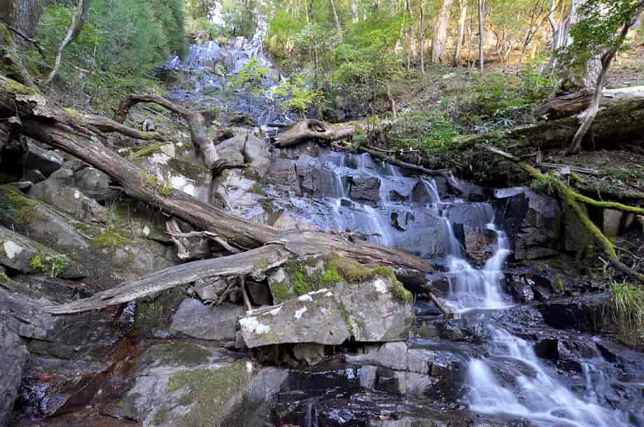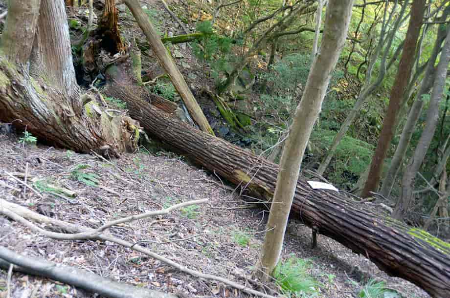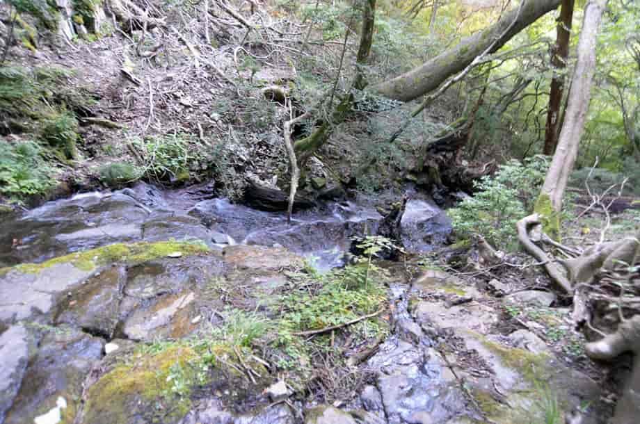 | ▲遊歩道の様子 | ▲途中にある滝を跨ぐように倒れている夫婦杉 |