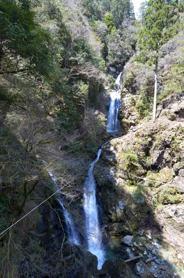 兵庫県宍粟市にある「原不動滝」は、原地区を流れる引原川の支流・八丈川に流れ落ちている。 落差は90m程で、養父市にある天滝と共に、兵庫県でもよく知られている滝でもある。 全体は三段の段瀑で、下段部分ではもう一つの流れが流れ込み、ふた筋のように見える。 この下段部分は、右側が男滝、左が女滝とも呼ばれているようで、この下段部だけでも随分見応えがする。 周辺もよく整備されていて、滝の全体は滝見台となる吊り橋の上から眺めることができる。 橋までの遊歩道もよく整備されていて、入り口から階段になっている遊歩道を登ってくると、まず下段部分が目に入る。 遠望することにはなるが、この部分だけでも立派な滝で、ふた筋になった流れが印象に残る。 また、この下段部分が遠望できるところにはベンチも設置されているので、ゆっくりと辺りの景観を楽しむことができる。 更に進んで滝見台となる橋のところに来ると、中段部分が目に入るが、橋の上を先に進むと、上段部分も目に入る。 この時に原不動滝の全体の様子を見ることができるが、周辺の景観とともに、思わず感嘆する。 中段の滝にもはっきりとした滝壺があり、上段と中段部分の落差だけでもかなりあるだろうことが遠望しただけでも分かる。 日本の滝100選にも選ばれているそうだが、この原不動滝は実に堂々としていて、素晴らしい。 この時は水量も十分で、全体の様子が深く心に残る。 時折、ミソサザイだろうか、鳥の声も聞こえ、清々しい。 滝周辺の自然もよく残っていて、四季折々の景観を楽しむことができそうでもある。 また、滝への入り口辺りには立派な不動尊を祀るお堂が建てられているが、この滝は、古くからの信仰の対象にもなっている。 お堂付近にある説明版によると、所縁は随分と古いもので、天保年間より「不動滝」と呼ばれていると記されている。 周辺にはキャンプ場なども設けられていて、原不動滝は観光滝でもあるが、周辺がよく整備されているのは、やはり信仰の対象にもなっているからなのだろう。 ところで、原不動滝は滝見台となる橋の上から眺めることになるのだが、これはやや味気ない感じがしないでもない。 橋の強度を保つためにワイヤーも張られていて、見る位置によっては、このワイヤーが気になってしまうのは残念ではある。 また、遊歩道を歩いていると、以前の遊歩道が脇に延びているのが見られる。 この道は下段の滝前へと続いているようだが、途中で斜面が崩落したのだろうか、大きな倒木が横たわっていて、滝前へ行くには、沢を登って行かなければならない。 しかし、沢は深くもあり、流れも強そうなので、かなり困難なように見える。 また、入り口にある不動堂のところからの山道を登って行けば、中段部分へたどり着くそうだが、この道も崩落などのため、かなり危険なようである。 原不動滝への交通・アクセス さて、原不動滝へは、国道29号線から入っていくことになる。 自動車の場合、中国自動車道・山崎インターからだと、インターを降りてから、そのまま国道29号線を北へ向かって行けばよい。 途中に国道429号線との分岐などがあるが、それも越えて進んで行くと、やがて道路右に「道の駅・波賀」がある。 ここも過ぎて更に進んで行くと、「原不動滝 ←」などと書かれた大きな案内標識がある。 その先の分岐を左へ入ることになるが、案内板のすぐ先の分岐ではなく、もうひとつ先の分岐を左へと入っていく。 手前の分岐のところには「原」のバス停と待合所があるので、これに注意して、その先の分岐を曲がる。 あとは渓流を右手に見ながら走っていくと、道路左に「原不動滝・駐車場」がある。 尚、分岐から更に国道を3〜4分程走ると、道路右に「そうめん滝」がある。 また、駐車場から少し進んで行くと道は突き当りになるが、2〜3台程度なら、ここの右側に駐車場がある。 ここまで、山崎インターから50分〜1時間程度で、国道から分岐した道も舗装されていて走りやすい。 駐車場のところにはトイレも設置されていて、そこから先は渓流の様子を楽しみながら歩いて行くと、不動堂があり、すぐ先に管理所の建物がある。 ここで200円ほどの整備協力金を払うが、金額については要確認。 管理所から遊歩道を歩いて行くと、石の階段などを登って下段の滝の滝見台を経て、不動滝全体の滝見台となる橋に着く。 入り口から滝見台まで10分程度で、遊歩道はよく整備されている。 尚、管理所の手前にある不動堂からの山道を登って行けば、中段の滝へ行くことができるが、この道は信者の為の道になっていて、一般観光客の入山は断られている。 また、途中の山道は斜面崩落などのため危険で、登って行かない方がよい。 滝見台となる吊り橋から先にも山道が延びていて、登って行くと、やはり全体の様子を見ることができる。 ただ、植物が繁茂する時期などは、やや見づらくなってしまいそうである。 いずれにしても、原不動滝は見事