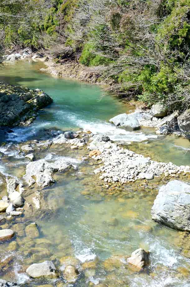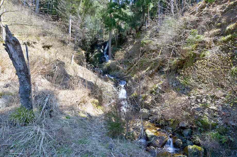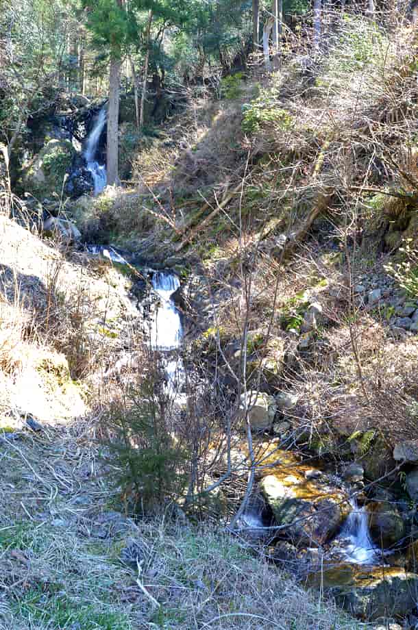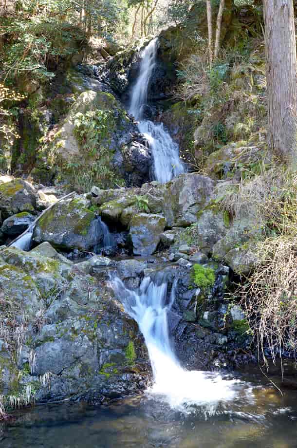 兵庫県宍粟市にある「いろは滝」は、千種町河呂地区を流れる千種川の枝沢に流れ落ちている。 道路際にある滝だが、名前が刻まれた石碑が建てられているだけあって、落差もあって奥行きが感じられる。 いろは滝は数段からなる段瀑で、落差は10〜12m程度と言われているが、道路から見える範囲では、もう少し落差があるように見える。 水の流れ落ちる様子にも変化があって、大きい滝ではないが、味わいがある。 普段の水量は分からないが、この時はやや少ないように見えたので、もう少し水量があれば、より見応えする滝でもある。 今では立派な道路脇に流れ落ちているが、この道が整備される以前は、直接千種川に流れ込んでいたのだろうから、落差もかなりあったのだろう。 ところで、この沢には大小様々な多くの滝があることから「いろは」と付けられているようで、この道路際の滝が「いろは滝」ではなく、「いろは滝」はこの沢にある滝の総称のようである。 その場合、この道路際の滝は「いろは滝・一の滝」などと呼称することになるのだろう。 いろは滝への交通・アクセス さて、いろは滝へは、自動車の場合だと、県道72号線沿いにある「笛石山・後山 登山口」の手前にある「観音公園」を目指せば分かりやすい。 「観音公園」も県道72号線沿いにあるので、山崎町や佐用町方面からだと、県道72号線を北上し、途中で国道429号線との交差点になる「室橋東詰」の交差点も、そのまま「千種市街」方面へ向かって直進する。 直進すると旧道になるので道は細くなるが、特に問題なく走ることができる。 しばらく行くと「千種市民局」の前を通り過ぎるが、そのまま走っていくと千種川を左に見て走るようになり、やがて道路左に「観音公園」がある。 ここには大きな観音菩薩の石像が祀られているので、見落とすことはない。 ここまで、「室橋東詰」の交差点からだと5〜6分程で、この観音公園の少し手前の道路右側に「いろは滝」と刻まれた石碑が建てられていて、滝はその横から流れ落ちている。 しかし、この石碑は案外目につきにくく、駐車する場所もないので、少し先にある観音公園まで行って、そこの駐車場に止める方が分かりやすい。 公園からは少しばかり来た道を戻っていくことになるが、公園からだと5分も歩けばいろは滝に着く。 道路際には名前が刻まれた石碑が建てられているので、歩いていればすぐに分かる。 また、付近には「鉈取り淵」があるが、観音公園を過ぎで少し行くと「松の木橋」が架かっていて、この橋を渡ったところ、道路の左側に「笛石山・後山 登山口」の入り口がある。 ここは少し広場のようになっていて、「教霊山・行者山・板馬見渓谷 登山口」との案内板などが設置されている。 ここにはトイレも設置されていて、自動車は付近の邪魔にならないところに駐車することができる。 そこから林道を3〜4分程も歩けば、「笛石山登山道入口」の橋があり、この橋のところに鉈取り淵がある。 |