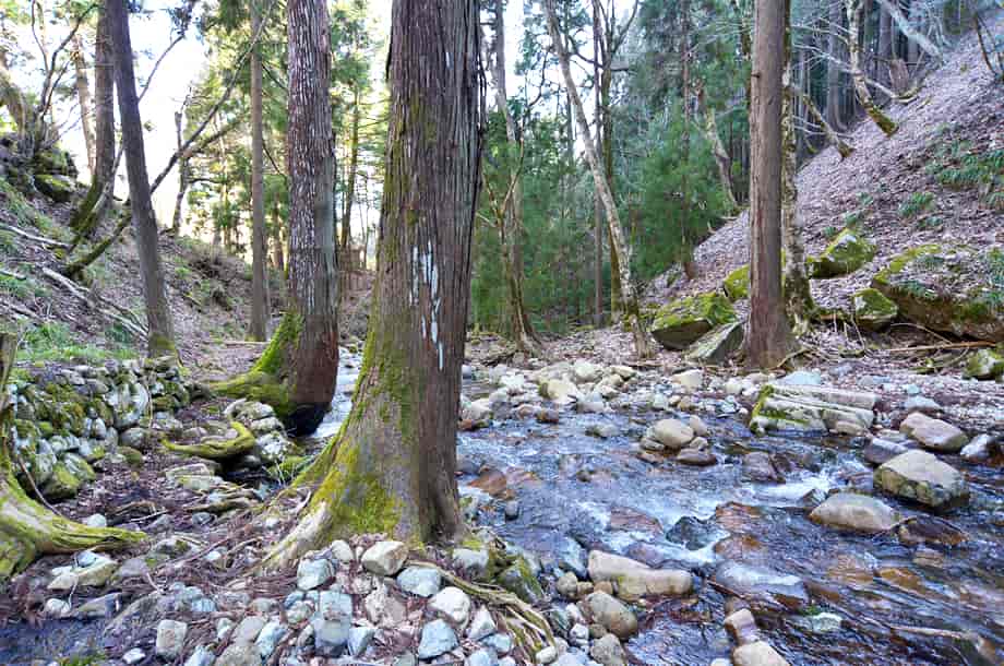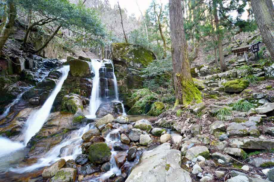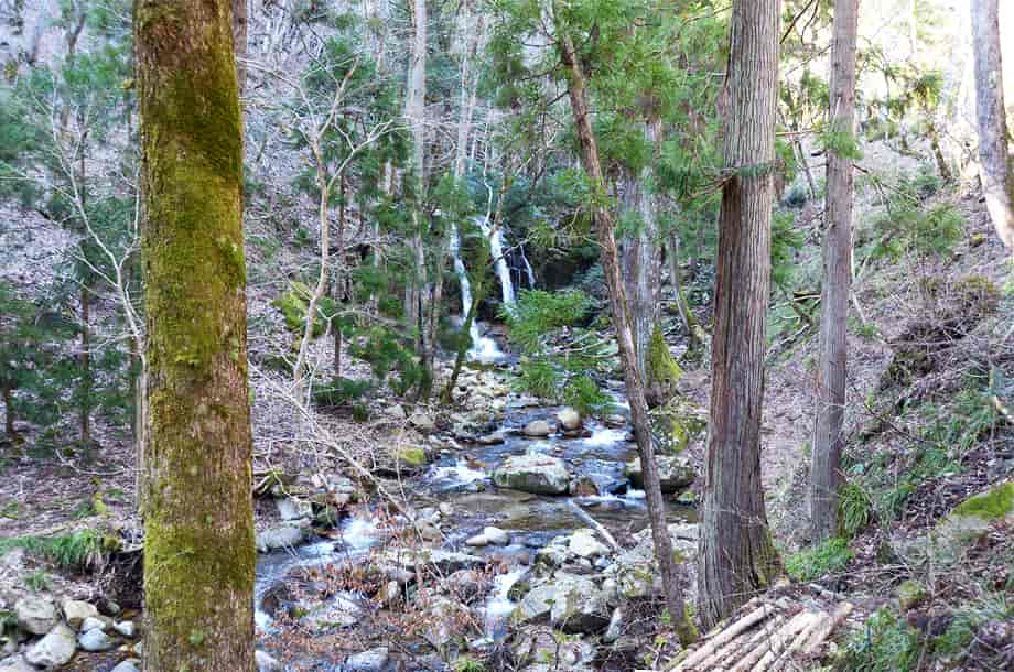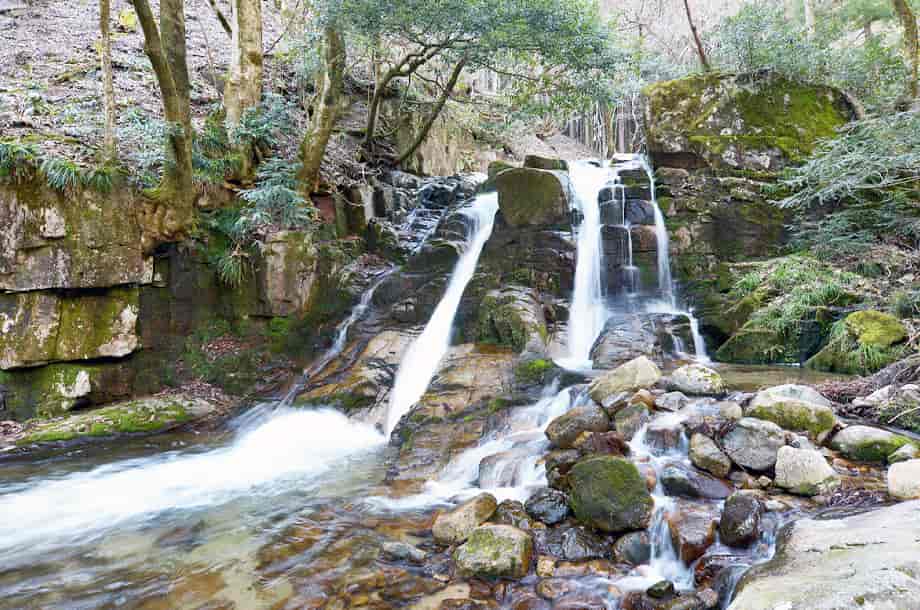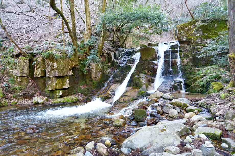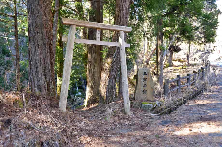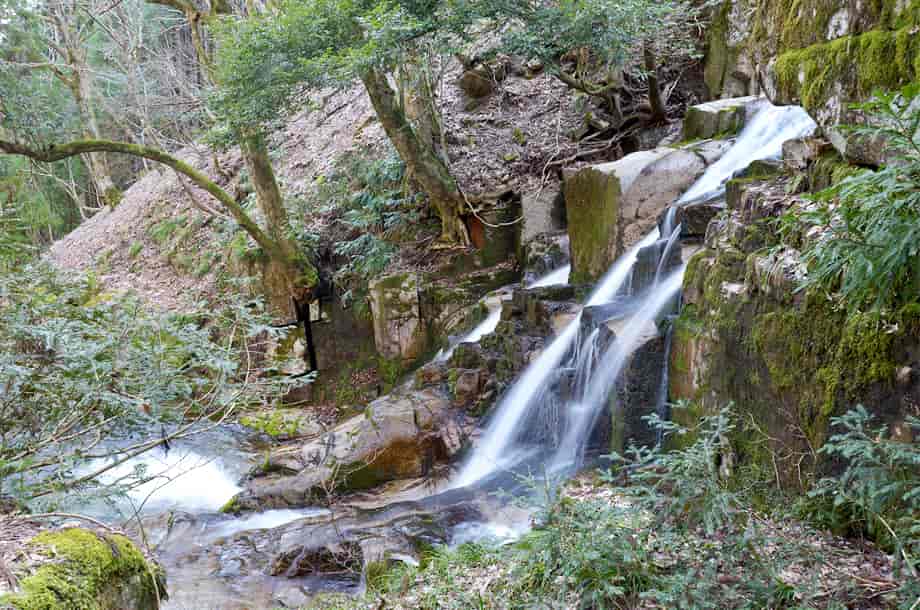 兵庫県宍粟市にある「三室の滝」は、千種町河内地区を流れる河内川に流れ落ちている。 落差は8m程だが落ち口が広く、開けた空間の中にあって、どっしりとした感じがする。 水は幾筋かになって流れ落ちているが、中程の流れのものは、一度滝壺に落ちてから跳ね上がっていて、特徴的な様子を現わしている。 水量が多い時には2m程も跳ね上がると言われているので、その時には、流れ落ちる水も岩全体を覆うようになるのかもしれない。 また、滝の水は絶えることなく流れているとも言われていて、滝横には祠が建てられている。 三室の滝は瀧神社の中にあるので、古くから信仰の対象にもなっていたのだろう。 ところで、道路脇にある鳥居を潜ると滝の様子を遠望できるが、初めて見た時には少しばかりの驚きがある。 滝前まで遠い距離ではないが、近づくにつれ、その景観に見入ってしまう。 三室の滝は大きい滝ではないが、特徴的な水の流れに辺りの景観も相まって、印象に残る滝でもある。 滝の右側にある祠の上から滝上にも行くことができるが、その眺めにも趣がある。 下流側も開けているので清々しく、鳥居を潜ってから滝前まで、期待が増していく滝である。 三室の滝への交通・アクセス さて、三室の滝は千種町河内地区にある三室山登山口を目指せば分かりやすい。 自動車の場合、山崎方面からだと県道72号線を走り、国道429号線と交わる「室橋東詰」の交差点も、そのまま「千種市街」方面へ向かって直進する。 「鉈取り淵」のある「笛石山・後山 登山口」も過ぎて進んで行くと、やがて分岐がある。 この分岐の手前には「← ちくさ高原 8km」の案内標識が立てられていて、県道はここで左へと向かって行くが、三室の滝へは、ここは曲がらずに、そのまま直進して行く。 (左へ曲がると「大釜の滝」に着く) 県道との分岐から、道なりに10分近く走ると、道路右手に広場がある。 ここは三室高原の入り口になっていて、案内表板のほか、簡易トイレも設置されているのですぐに分かる。 自動車は広場の邪魔にならないところに駐車して、この広場が終わった辺りの道路左側に瀧神社の鳥居と、「三室の滝」と刻まれた石碑が建てられているので、滝へはこの鳥居を潜って、先に延びている遊歩道を歩いて行けばよい。 鳥居辺りから滝を遠望することができ、滝前までの遊歩道もよく整備されているので歩きやすい。 また、広場のやや奥にも赤い鳥居があるが、これを潜っていくと木山神社へ向かうことになるので注意する。 尚、この広場から少し先に進むと右に入る脇道があり、分岐には「三室山登山口・右」の案内板も立てられている。 この脇道を入った少し先に登山用の駐車場があるので、こちらに駐車してもよい。 但し、冬期の積雪時は、周辺は通行不能となるので、交通については確認する必要がある。 |