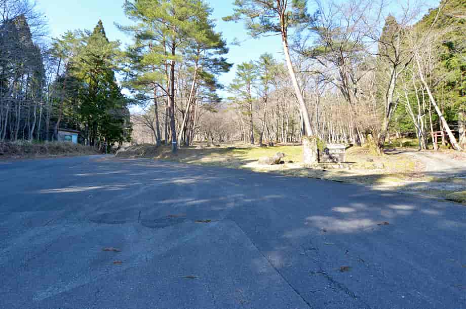 | ▲三室高原入り口の広場・滝へは広場奥の鳥居を潜っていく | ▲瀧神社の鳥居と「三室の滝」の石碑 |