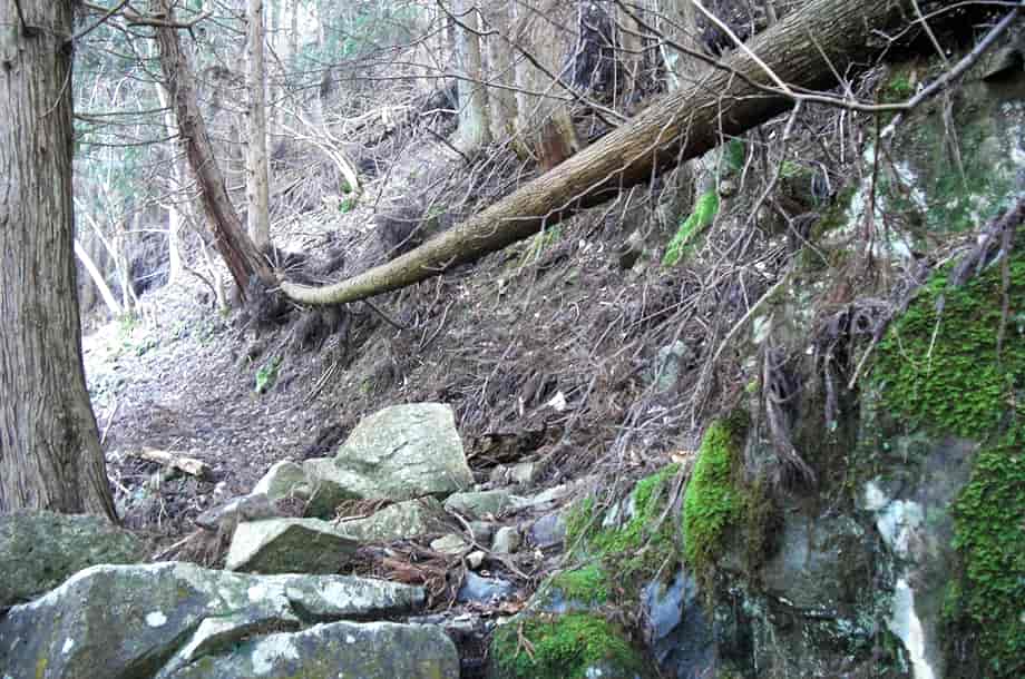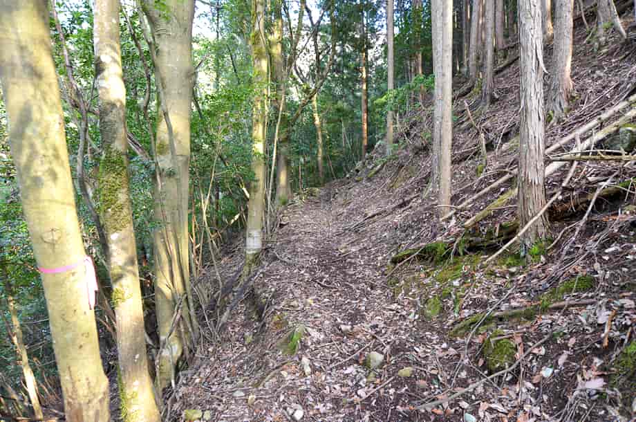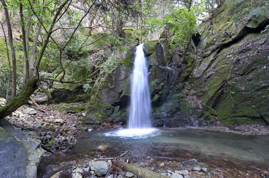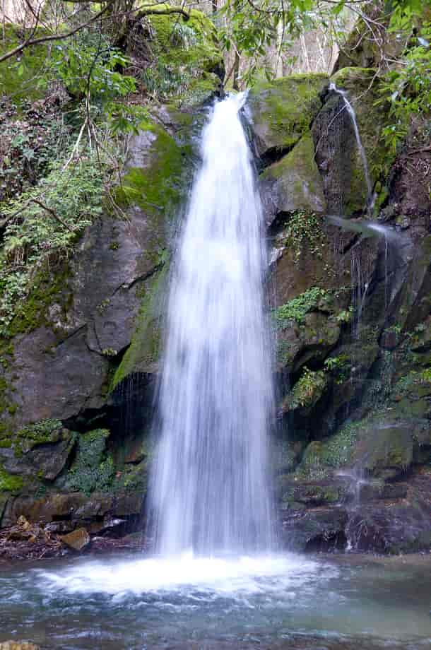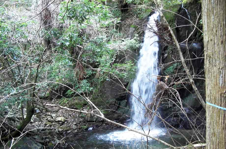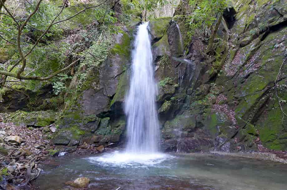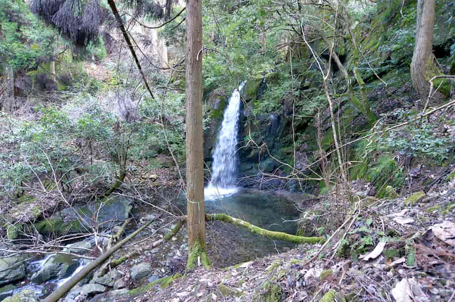 兵庫県宍粟市にある「小の倉滝」は、一宮町福知地区を流れる福知川の枝沢に流れ落ちている。 落差7〜10m程度の滝で、大きくはないが趣がある。 県道にある入り口からそれほど距離はないのだが、ずっと登りが続くので、山道を歩いてきて滝を遠望できた時には、その様子に疲れも忘れてしまう。 生憎、滝前には倒木があるが、 閑静な中、水が流れ落ちる様子は美しく、端正な印象を受ける。 滝壺も広く、滝前も開けているので清々しく、何か心に残る滝でもある。 それは、小の倉滝は信仰の場でもあり、霊場になっているからかもしれない。 入り口にある案内板には「雨乞不動」とも書かれているが、よく見ると、滝が流れ落ちる岩肌の右下辺りに、不動尊らしい石仏が安置されている。 苔生しているうえ、水の流れではっきりとは分からないが、多分、不動尊なのだろう。 滝の様子も、滝行をなすには相応しい感じで、かつては雨乞いのために滝行が行われていたのだろうか。 小の倉滝はその様な滝でもあるので、周辺も厳かな印象で、何か心に残るものがある。 小の倉滝への交通・アクセス さて、小の倉滝へは、付近にある福地渓谷を目指せば分かりやすい。 自動車の場合、中国自動車道・山崎インターからだと、インターを降りてから国道29号線を一宮方面へ向かって北上する。 20〜25分ほどで「安積橋」の交差点があるので、ここは直進して「養父」方面の県道6号線へ進む。 そのまま10分ほど走っていくと県道39号線との分岐があり、ここは「神河」方面へ向かって右折する。 分岐手前には案内標識があるが、「福地渓谷 4km →」の表示もされているので、見落とすことはないと思う。 右折してから2〜3分、距離にして1.5km程も進むと、道路右手に墓地があり、その脇に「小の倉滝 登り口」と書かれた案内板が立てられている。 この案内板はやや見づらいかもしれないが、道路向かいには「樽垣内橋」が架かっているので、これにも注意するとよい。 ここまで、山崎インターから30〜40分程で、自動車は、付近の待避所になっているような幅の広いところに駐車することができるが、交通の邪魔にならないように注意する。 滝へは、まず墓所のところにある柵を開けなければならないが、すぐ上にも、もうひとつ獣除けの柵がある。 ここから山道に入っていくが、柵を開けた後は、必ず閉じておくようにする。 山道ははっきりとしていて、迷うようなことはないが、ずっと登りが続き、石などもやや多い道なので、急がずに進んで行く方がよい。 しばらく登って行くと「小の倉滝霊場」の案内板がある。 ここは道が分岐しているようにも見えるが、そのまま直進(右の登り坂の方へ)する。 更に歩いて行くと、二つ目の案内板があるので、ここも直進(左の方にも見える)して進むと、ほどなく滝が遠望できる。 入り口からここまで15分程だが、登りが続くので、やや長く感じるかもしれない。 しかし、小の倉滝が目に入った時は、ここまでの疲れも忘れてしまう。 また、山道には倒木などもあるが、道は全体に整備されているようで、はっきりとしている。 尚、帰り道は間違うことはないと思うが、道路が下に見える辺りで道が分岐しているが、ここは右へ下っていく。 導水用のような黒いホースが延びている方の道で、このホースはゲート付近まで延びている。 |