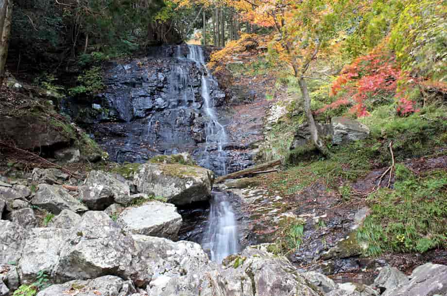 兵庫県多可町にある「三谷大滝」は、加美区三谷地区を流れる三谷谷(みだにたに)川の上流部に流れ落ちている。 千ヶ峰登山道・三谷コースの途中にある大きな滝で、雌雄ふたつの滝からなっている。 山道を歩いて行くと、ほどなく「雌滝」が現れるが、雌滝は落差40m、長さ200m程もある長大な滝で、その様子は印象に残る。 その雌滝の左(右岸)側の山道を登って行くと、やがて雄滝が遠望できるようになる。 雄滝の落差は15m程で、大きさでは雌滝と比べようもないが、雄滝ははっきりとた段瀑になっている。 滝周辺は岩が多いが、開けていることもあり、全体の様子を見て取れる。 その様子は、雌滝とは違った新鮮さがあり、雌雄の滝は全く違った様子がおもしろくもある。 雄滝の上段の滝は凹凸のある岩肌に水が流れ落ちていて、さざ波を打つようにも見える。 そこからの流れは下段の滝へと続くが、下段の滝では、小さいながらもはっきりとした滝壺が見られる。 水は滝壺から右へと流れ、やがて長大な雌滝の流れに続いている。 ところで、この時の水量は少ないようであったが、雄滝周辺は紅葉が残っていて、美しい景観をつくり出していた。 右斜面を登り、紅葉越しに見る雄滝は味わいがあり、滝下から見る滝とは、違った滝のようにも見える。 上下段をはっきりと見るのは難しいが、それぞれの部分だけも美しい。 三谷大滝・雄滝への交通・アクセス さて、三谷大滝・雄滝は、千ヶ峰登山道・三谷コースの途中にあるが、登山口までの交通は雌滝のページで紹介しているので、雄滝へは、そのまま山道を進んで行くと、入り口から10分程で滝前に着く。 山道は雌滝の横に延びているが、道ははっきりとしていて歩きやすく、迷うようなこともない。 山道からは、雌滝の落差のある長い様子を見て取ることができ、上方部分が滑床になっているのもよく分かる。 雌滝の落ち口辺りには案内板が立てられていて、ここから少し進めば雄滝を遠望できるようになる。 また、途中の沢には小さな橋が架けられている。 この時は岩の多い沢を上って行くこともできたが、水量が多ければ、この橋が役に立つのだろう。 |