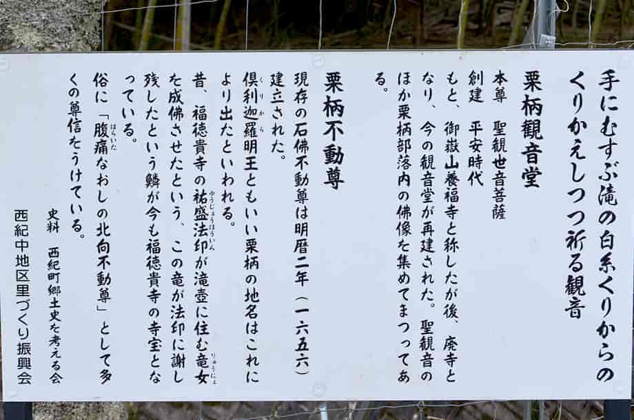 | ▲分岐にある説明板 | ▲滝の入り口にある観音堂 |