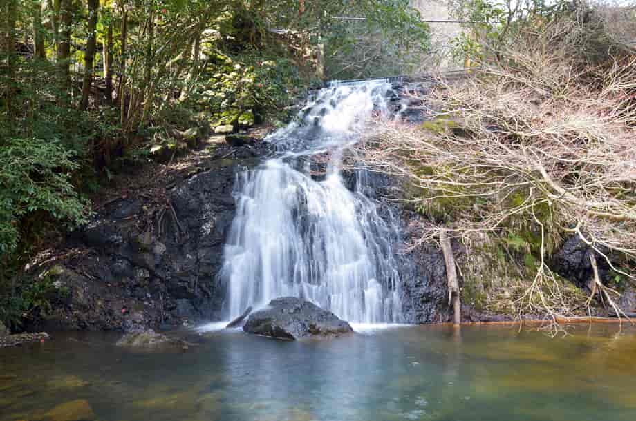 兵庫県丹波篠山市にある「丸山の滝」は、丸山地区を流れる黒岡川に流れ落ちている。 斜瀑なのだが、緩やかな段瀑のようでもあり、その様子がおもしろい。 落差は8〜10m程だろうか。 すぐ上流側には「葆澤池(ほうたくいけ)」があるので、落ち口は堰堤の一部になっているが、水は幅広く流れ落ちていて、広い滝壺をもっている。 この滝壺は淵をつくっていて、ここからの流れが、再び黒岡川をつくり出している。 水量は池の貯水量によって変わるのだろうが、この時の水量は程よく、布滝のようにも見える。 ところで、葆澤池は、元は上水道の水源地として利用されていたようだが、現在はその役目も終え、景勝地になっている。 付近にはベンチなどが設置されていて、特に紅葉の時期は、訪れる人も多いようである。 滝周辺もよく整備されていて、視界も開けているので清々しく、時折鳥の声も聞こえてくる。 丸山の滝への交通・アクセス さて、丸山滝へは、自動車の場合、南丹市方面からだと、国道372号線を篠山方面へ向かって西へ進む。 やがて「城東支所前」の交差点があるので、ここを右折して県道304号へ入る。 道なりに進んで行くと、「泉」の交差点から先は県道305号線や県道301号線になるが、そのまま走って行くと「城北」の交差点で県道544号線と交差するので、この交差点を「丸山」方面へ向かって右折する。 あとは、道なりに走って行くと道路は終わり、その先に葆澤池があり、丸山の滝が流れ落ちている。 県道544号線に入ってからだと10分もかからず、舞鶴若狭自動車道・丹南篠山口インターからでも、県道301号線から県道544号線を進み、20分程で着く。 途中、道幅の狭いところもあるが特に問題はなく、自動車は、道路終点付近に水利施設の様な建物があり、その手前に広い「御嶽・登山駐車場」があるので、そこに駐車することができる。 駐車場から1〜2分程歩いて行くと、左手に滝が流れ落ちているのが見える。 周辺はよく整備されていて、付近りには、ベンチも設置されている。 その他、丸山の滝へは、途中の畑地区からは県道301号線へ進んで行くが、県道301号線を「本郷」方面へ向かって右折すると、10分程で「おのぶの滝」の入り口に着くので、時間があれば足を延ばしてみるのもよい。 |