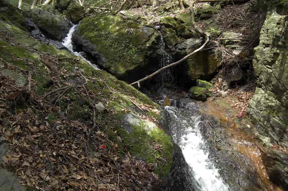 兵庫県丹波篠山市にある「おのぶの滝」は、火打岩地区を流れる畑川の枝沢に流れ落ちている。 全体は小さな滝が続く連瀑といった様子で、落差は15m程だろうか。 岩の間を流れ落ちるような段瀑でもあり、水の流れにも変化があっておもしろい。 ただ、流れは複雑なので、滝全体の様子を一望することができないので、落差は更にあるのかもしれない。 上段部、中段部、下段部と別けてみると、下段部は二段の段瀑になっていて、おのぶの滝の中では、もっとも滝幅がある。 ここから右岸(左斜面)を登って行くと、斜瀑のような先に「逆くの字」に見える滝があり、これが中段部分の一部になっている。 ここから上段部へは、この滝を跨いで、一度対岸へ渡り、やや登ってから、再び左斜面(右岸)に戻らなければならない。 上段部も段瀑になっていて、よく見ると、落ち口はふた筋になって水が流れ落ちているが、中段から上段部にかけては足場が限られてしまう。 落ち口からの上流側にも、小さな渓流滝がいくつか見られるが、この辺りは緩やかな流れになっていて、おのぶの滝とは違った景観をつくり出している。 ところで、おのぶの滝は、全体に傾斜のある長い滝だが、下段部からロープが張られているので、それを伝って行けば、落ち口まで登って行くことができる。 但し、斜面の傾斜は思ったよりも急で、岩が濡れていると滑ることもあるので、登って行くときは、十分に注意した方がよく、無理だと思えばやめておいた方がよい。 また、張られているローブも、全体に古くなっているので、強度をしっかりと確かめた方がよい。 この時も、中段部の右岸から左岸に渡り、少し登ろうとしてロープの強度を確かめたところ、僅かな力で切れてしまった。 どうにか再び右岸へ戻ることができたが、どのロープも張り替えられていないなら、かなり古くなっているはずなので、ロープを頼る場合にも十分に用心して、強度などを確かめた方がよい。 右岸に戻ると上段部で、ここにも落ち口辺りまでロープが張られているが、これにも注意した方がよい。 この時は、どうにか落ち口から上の渓流の様子も見ることができたが、帰りは再び滝を降りていくのは無理だと思ったので、滝を降りるのではなく、上流側の沢沿いを歩いて行き、右側上方に道路らしいものが見えた辺りで、斜面を登って道路に出た。 上流側の沢沿いは、踏みあとらしい道もあり、斜面もそれほど急ではないので、落ち口から5〜10分程で道路に出たと思う。 ただ、戻ったところは、入り口だった案内板付近からは随分離れたところで、下り坂を少しの間戻らなくてはならなかった。 いずれにしても、おのぶの滝は、ロープがなければ登って行けないほど足場が悪いので、ロープが古くなっていたり、なくなっていたりする場合は、登って行くのはやめておいた方がよい。 それにしても、「おのぶの滝」とは女性の名前から付けられていると思うのだが、その謂れなどは分からない。 時折、女性の名前が付けられている滝があるが、この滝の由来がどのようなものなのか、やや気にかかる。 宍粟市に「延ヶ滝」という名前の滝があるが、この滝は、「お延」という女性が身を投げと言われいることから付けられているが、この滝もその様な悲しい話などが伝わっているのかもしれない。 おのぶの滝への交通・アクセス さて、おのぶの滝へは、自動車の場合、南丹市方面からだと、国道372号線を篠山方面へ向かって西へ進む。 やがて「城東支所前」の交差点があるので、ここを右折して県道304号へ入る。 道なりに進んで行くと、「泉」の交差点から先は県道305号線になるが、そのまま走って行くと「本郷」へ向かう県道301号線との交差点があるので、ここを右折して県道301号線へ進む。 この交差点は「畑」になると思うが、交差点には信号機や住所表記がないので、手前にある案内標識に注意しておくとよい。 あとは道なりに走って行けばよいが、右折してからの道は狭くなるが、県道なので特に問題はない。 道は、次第に山の方へ向かって行くが、やがて道路左に「おのぶの滝」と書かれた案内標識がある。 この標識は、左にあるガードレールが切れたところの斜面にあるので、やや見づらいが、ここを過ぎて少し進むと道は大きく左へと曲がるので、案内板はそのやや手前にある。 また、大きく左へと曲がって進んで行くと峠になり、広場もあるので、そこまで行くと随分行き過ぎていることになる。 この案内板まで、県道301号に入ってから7〜8分程で、自動車は、この少し先がやや広くなっているので止めることができるが、駐車位置には注意した方がよい。 また、舞鶴若狭自動車道・丹南篠山口インターからでも、20〜25分程で案内板のところに着く。 おのぶの滝へはこの案内板のところから入って行くが、沢へ降りるとすぐに堰堤がある。 沢沿いに少し進むと小さな滝があり、更に進むとふたつ目の堰堤がある。 ここからは、沢を左に見るよ