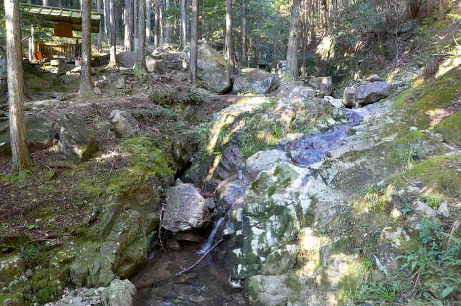 | ▲林道終点からすぐ先にある参道口 | ▲滝近くにある休憩所 |