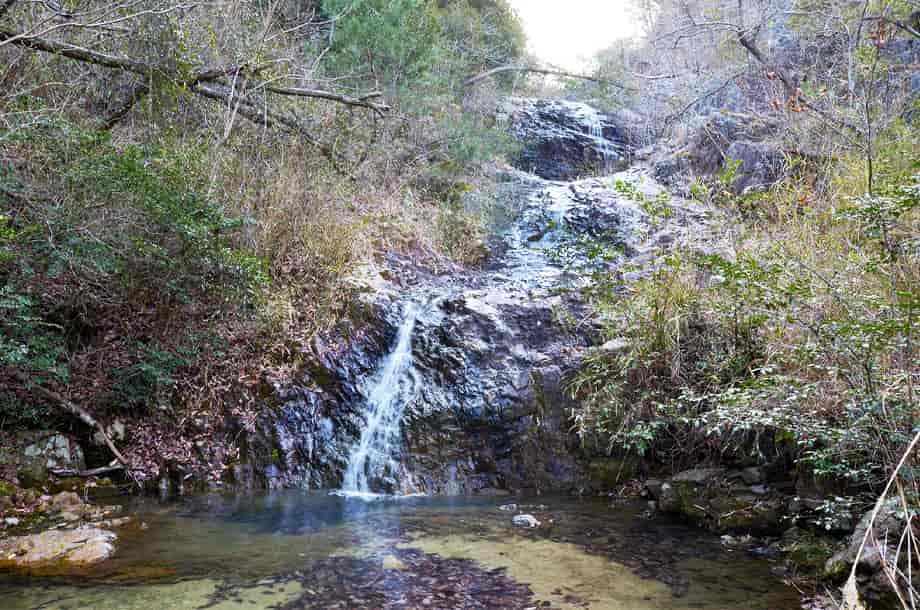 たつの市揖保川町にある「不動滝」は、原地区を流れる馬路川の上流部に流れ落ちている。 他の不動滝との混同を避けるため、ふつう「馬路川不動滝」と呼ばれているが、「めぐみの滝」とも呼ばれているようである。 馬路川不動滝は全体が三段の段漠で、落差は16〜17m程か、ややそれを超えているようにも見える。 水量は少し少ないようだったが、滝前は開けていて、全体の様子を見て取ることができる。 水が多いと、半ば布滝のようにも見えるのかもしれない。 辺りが閑静なこともあり、落ち着いた感じを受ける滝で、趣ある滝でもある。 ただ、あまり人が訪れないのか、周辺はやや荒れた感じがしないでもない。 信仰の滝でもあり、滝近くには簡素ながらもお堂の様な小屋が建てられていて、不動尊などの石仏が安置されているが、ここも最近は手入れされていないようだった。 また、滝脇にも石仏があるらしいのだが、この時には確認できなかった。 ただ見落としてしまっただけのことかもしれないが、少しばかり気にかかる。 ところで、不動滝の各段は味わいがあるが、滝の右側、左岸側にロープがあるので、上段部分の滝前まで行くことができる。 斜面途中から見ると、それぞれに趣があり、違った印象を受けるが、岩が濡れていると滑りやすいので、足元には注意する必要がある。 尚、滝近くには「原 めぐみの滝」と書かれた標柱が立てられているらしいが、この時は見られなかったので、この後に立てられたのかもしれない。 馬路川不動滝への交通・アクセス さて、馬路川不動滝へは、自動車の場合、姫路・太子方面からだと、国道2号線を西へ進み、揖保川を越えて少し先にある「正條」の交差点を左折する。 左折してしばらく行くと、橋を渡った先に「山津屋」の交差点があるので、ここを右折する。 右折した道は県道442号線で、道なりに走って行くと山陽新幹線の高架があるので、この高架の手前の分岐を左折して、橋を渡る。 ここからの道は細くなるが、特に問題はなく、少し行くと獣除けのゲートがあるので、これを開けて先へ進む。 但し、ゲートを開けた後は、必ず閉めておくようにする。 ゲートから進んで行くと、底がコンクリートで舗装された川があるが、これを過ぎて進んで行くと、右手にコンクリート製の橋がある。 自動車は、この橋の手前が広くなっているので、その辺りに止めることができる。 ここまで、「正條」の交差点から10分程度で、山陽自動車道・竜野西インターからでも10分はかからない。 不動滝へは、橋を渡って進んで行くが、200m程で堰堤がある。 この堰堤は簡単に越すことができ、堰堤を越すと右手に沢があるので、あとは沢沿いに進んで行くようにする。 左岸に山道が見えるが、右岸、左岸のどちらでも、歩きやすい方を進んで行けばよいが、この時は、水がほとんどなかったので、途中まで沢の中を進み、水が多くなったところで、沢の右岸、向かって左手にある山道の方を歩いて行った。 駐車位置から滝前まで10分程度で、道はほぼ平坦で歩きやすいが、植物が繁茂する時期などは、沢沿いの道や、林道の一部などはやや歩きづらいかもしれない。 |