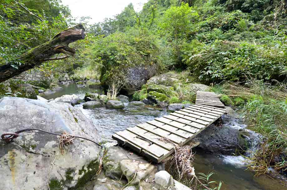 | ▲下流側に架かる木製の橋 | ▲下流側からの遠望 |