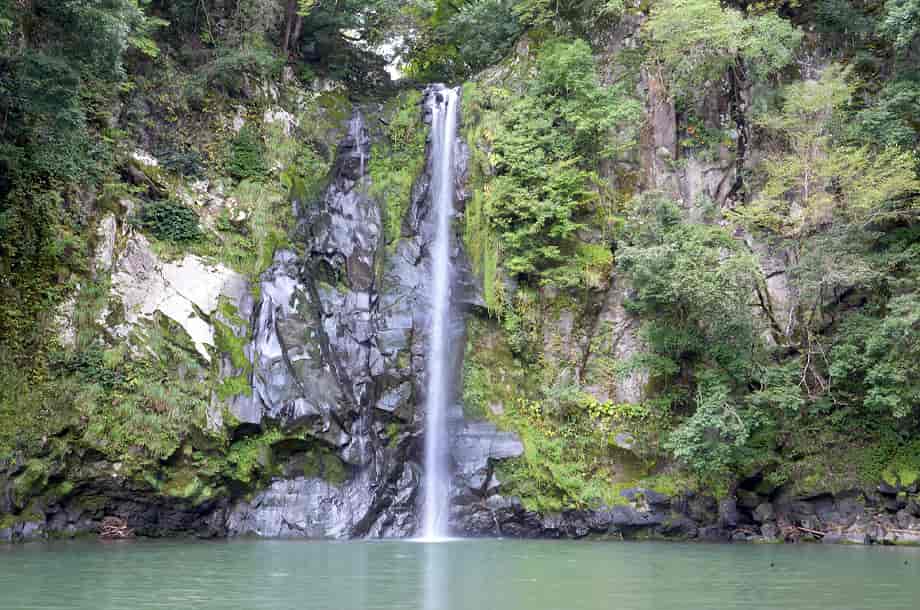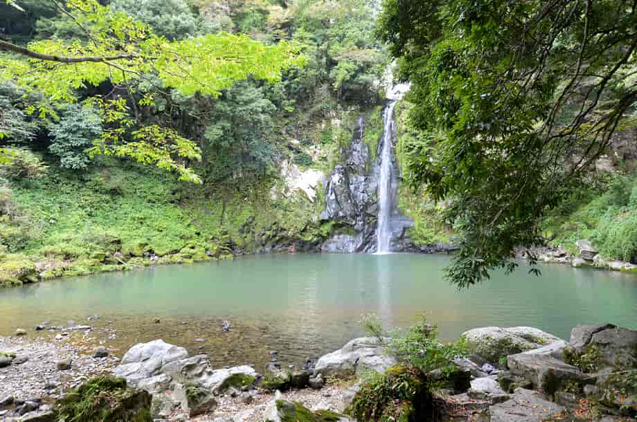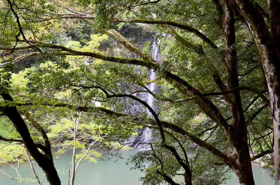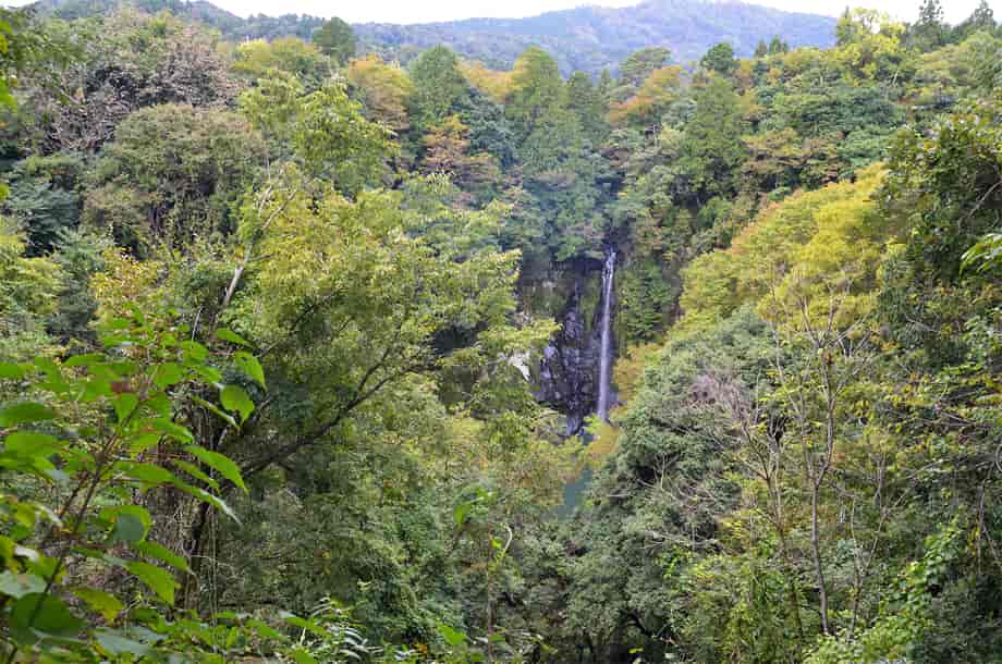 兵庫県豊岡市にある「八反滝」は、日高町名色地区を流れる稲葉川に流れ落ちている。 落差23〜25m程の端正な滝で、滝壺は、そのまま大きな淵をつくり出している。 その光景は印象に残り、滝前は広く開けていることもあり清々しく、八反滝は風光明媚というに相応しい。 滝前までの遊歩道もよく整備されているが、八反滝は入り口付近からでも遠望することができる。 その辺りから眺める様子も素晴らしく、大きな淵も樹木の間から垣間見ることができる。 滝前までの遊歩道はずっと下りが続くが、途中からの眺めにも味わいがあり、辺りの景観を含め、印象に残る。 四季折々の景観を楽しむことができそうな滝でもあり、眺めていても飽きることがない。 この時の水量はやや少ないようにも思えたが、その分、落ち着きある滝のようにも感じられた。 ところで、八反滝は神鍋溶岩流がつくり出した滝のひとつで、付近にある説明版によると、「滝の長さが布八反にあたることからその名が付けられている」と書かれているが、八反滝は、「稲葉川流域ではもっとも大きな滝でもある」とも書かれている。 また、上流側には「俵滝」が流れ落ちていて、この八反滝は神鍋溶岩流の中では2番目の滝になるのだが、滝前から少し下流側へ行くと木製の橋が架けられているので、周辺はハイキングコースにもなっているのだろう。 この橋を渡って歩いて行くと、下流側にある「まぼ」と呼ばれる3番目の溶岩流の滝に着くのだと思うが、この時は歩いていないので、どこまで続いているのかは分からない。 尚、「まぼ」は「間歩(まぶ)」が訛ったものらしいが、かつては付近に鉱山などがあったのだろうか。 八反滝への交通・アクセス さて、八反滝は俵滝の下流側にあるが、俵滝までの交通はそのページで紹介しているので、俵滝からだと北近畿豊岡自動車道方面へ向かって、2kmほど国道を戻ることになる。 国道482号線を走って行くと、「← 但馬ドーム」と書かれた案内標識のある分岐の少し先で、道は緩やかに左に曲がるようになる。 この曲がりはじめとところに、右への脇道が延びているので、八反滝へは、この分岐を右折する。 よく見ると、道路左に「八反滝 →」の案内表紙が立てられているが、この標識は目につきにくいので、正面に見える「智崇院」に注意すれば分かりやすい。 この交差点を右折すると「← 八反の滝」と書かれた案内標識が電柱に掛けられているので、それに従って智崇院沿いの道へ進む。 道はすぐに突き当りになるので、ここを左折するが、この分岐の正面にも「← 八反の滝」と書かれた案内標識が架けられている。 この突き当りを左折すると、程なく道路の右側に駐車場あり、「八反滝 →」の案内標識も立てられている。 滝への遊歩道は駐車場の横から延びていて、すぐに八反滝を遠望できる。 日高神鍋高原インターからだと15分ほどの距離で、遊歩道はよく整備されていて、入り口から5分程で滝前に着く。 また、滝周辺はよく開けているので、ゆっくりと過ごすことができるが、下流側へも遊歩道が続いている。 |
