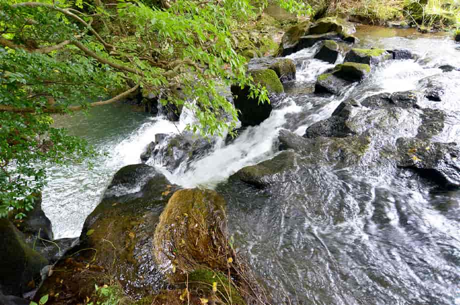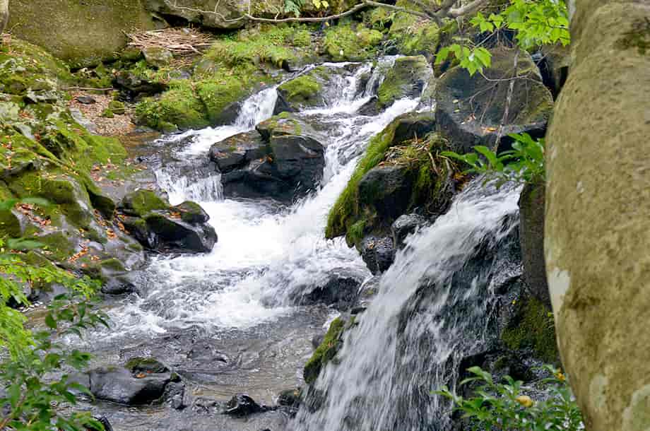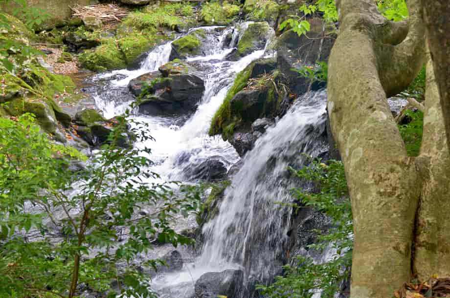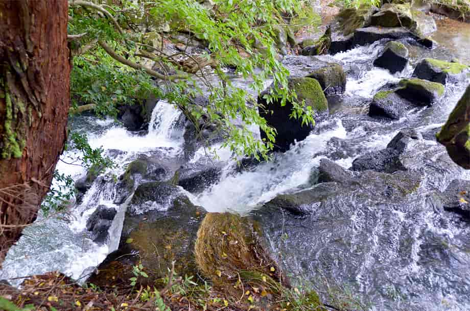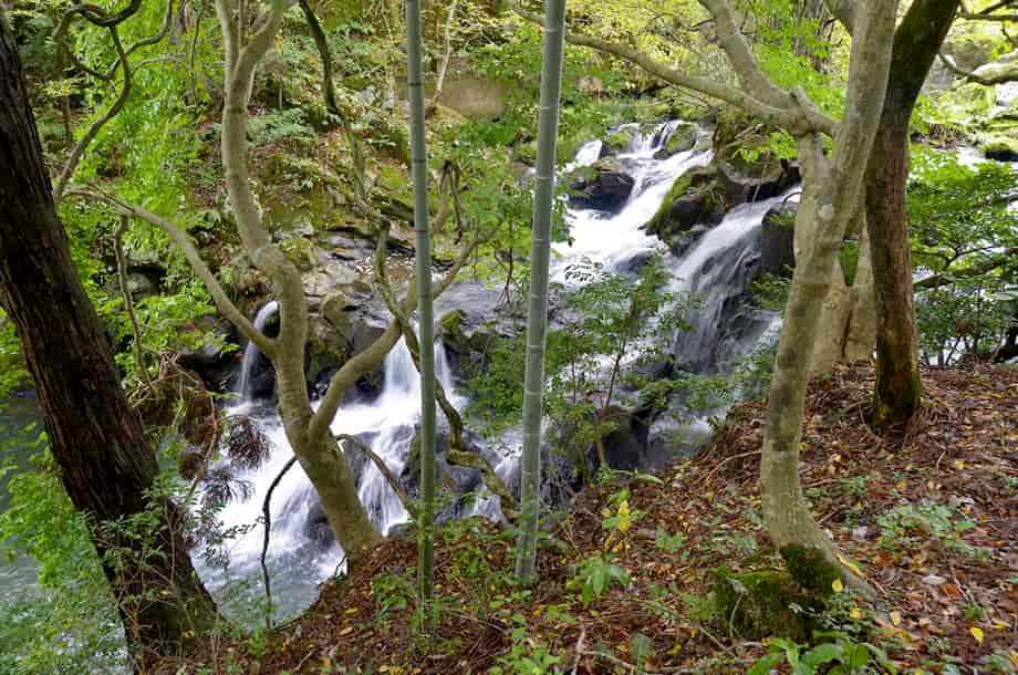 兵庫県豊岡市にある「俵滝」は、日高町来栖野地区を流れる稲葉川に流れ落ちている。 神鍋溶岩流によってつくり出された滝で、落差は7〜8m程だろうか。 大きな滝ではないが、堂々としていて、力強さを感じさせる滝でもある。 全体は二段か三段の段瀑だが、斜瀑のようにも見える。 岩の間を幾筋にもなって水が流れ落ちる様子は味わいがあり、滝下にははっきりとした滝壺も見られる。 また、神鍋溶岩流の滝の中ではもっとも上流側にある滝だが、落ち口から上の流れは穏やかで、所謂小川のようになっている。 その小川の流れが、ここで段差を造って俵滝を形成しているが、すぐ上の穏やかな流れがこの滝をつくっているのを見ると、やはり自然のおもしろさが感じられる。 残念ながら、滝付近は急斜面で滝下に降りることはできず、下流側への道も途中で植物によって遮られていたので、この時は遊歩道からの眺めに止めておいた。 対岸を見ると、やはり名板が立てられていて、遊歩道か山道らしいものも見られたので、対岸からなら滝下へ降りることができるのかもしれない。 いずれにしても、遊歩道からの眺めになってしまったが、全体の様子は見て取ることができた。 尚、神鍋溶岩流は、およそ70万年前から1万年前にかけて、神鍋火山群から流れ出た溶岩流が、稲葉川に沿って約15kmに渡って流れ出たもので、この溶岩流と川の浸食によって、稲葉川沿いには幾つも滝がつくり出されている。 この俵滝は、その中でももっとも上流側にある滝だが、すぐ下流側にある「八反滝」は稲葉川の中で最大で、25m程の落差があり、更に下流側にも多くの滝が見られる。 俵滝への交通・アクセス さて、俵滝へは、自動車の場合、北近畿豊岡自動車道・「日高神鍋高原」インターからだと、インターを降りて左折し、国道482号線を「村岡」方面へ向かう。 そのまま道なりに15分ほど走って行くと、道路右側に「道の駅・神鍋高原」がある。 ここを過ぎて600〜700mほど進むと、道路右側に「← 来栖野駐車場」など書かれた案内標識があるので、この分岐を左折する。 ここには「風穴」と書かれた案内標識も立てられているので、それにも注意するとよい。 国道の分岐を左へ入ると、すぐに広い駐車場が右側にあるが、この駐車場は国道からでも見えていて、かなり広い。 主にスキー客用のものかと思うが、季節によっては有料になるのかもしれないので要確認。 俵滝へは、この駐車場のもっとも奥から入って行くが、駐車場の奥から左を見ると、全但バスの「栗栖野」バス停がある。 このバス停の向かい側に路地が延びていて、バス停からだと見えないが、路地の入口に「← 俵の滝・入り口」と書かれた案内標識が立てられている。 この路地を入って行くと、途中にも案内板が立てられているので、それに従って歩いて行くと、迷うようなことはない。 途中から林の中を抜けて行くが、道はよく整備されていて、駐車場から平坦な道を10分ほど歩くと滝近くに着く。 滝付近には名板も立てられているので、すぐに分かる。 また、俵滝の様子は、名板の辺りから覗き込むようになるが、斜面は急なので、足元には注意する必要がある。 |