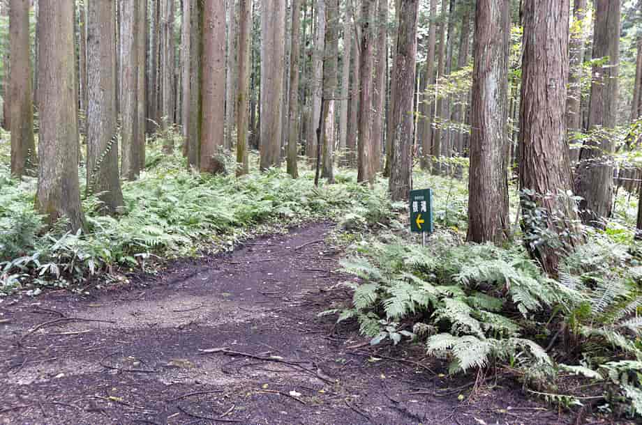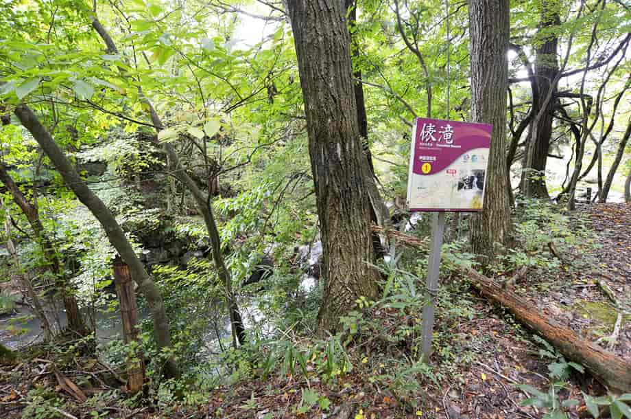 | ▲遊歩道入り口の様子 | ▲名板と奥に見える俵滝 |