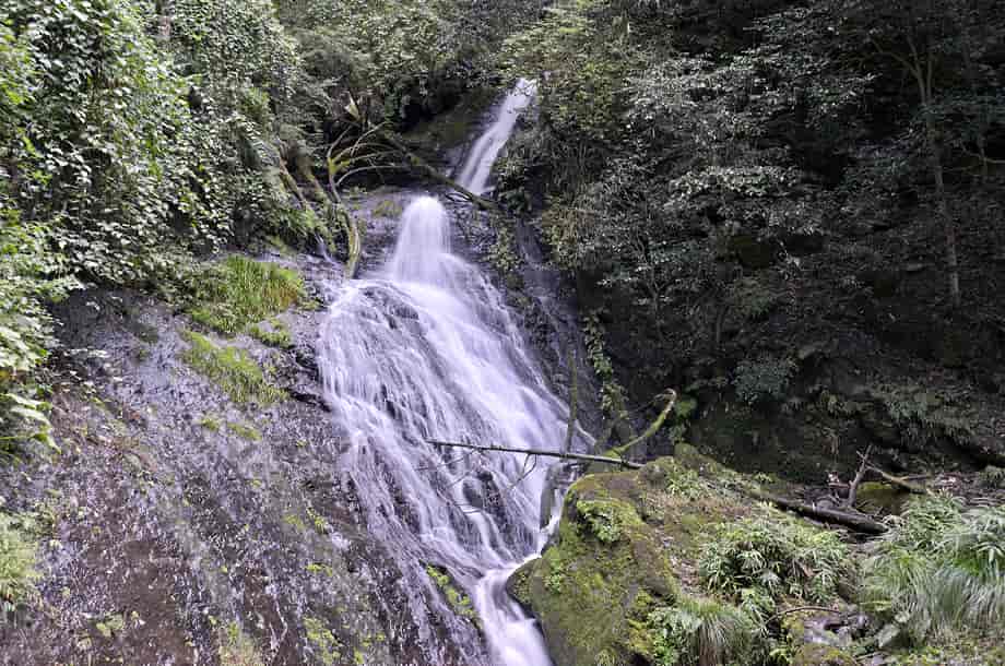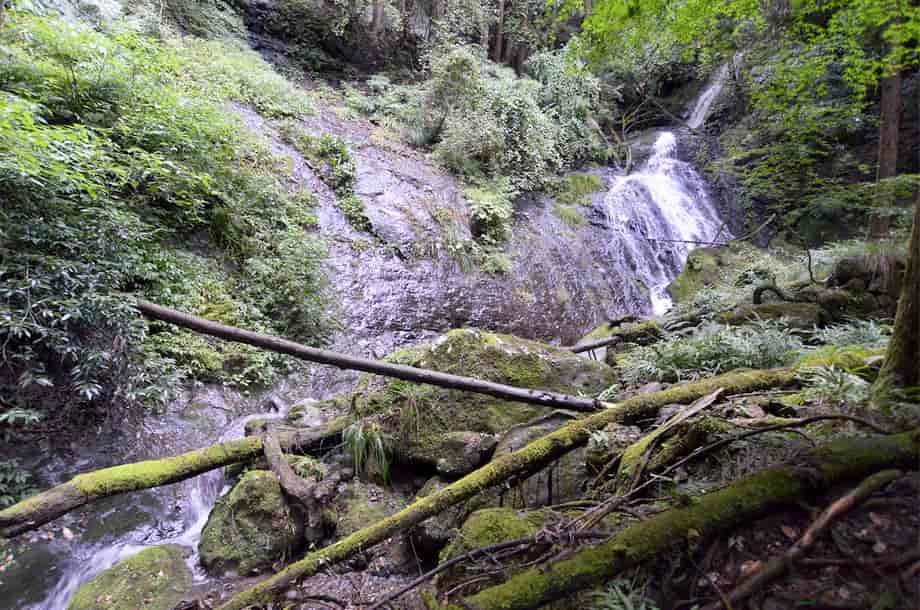 兵庫県養父市にある「今滝寺川(こんりゅうじがわ)の滝」は、八鹿町今滝寺地区を流れる今滝寺川に流れ落ちている。 全体は幾段かの段瀑で、落差は18〜20m程だろうか。 上段部分は樹木に隠れて見づらいが、奥行きのある滝で、水の流れにも変化があっておもしろい。 滝前や、ここまでの道は荒れた感じがするが、林道近くにある滝とは思えぬほど立派な滝でもある。 付近には「今滝寺の滝」などがあるが、どちらの滝も、名前が付けられていてもよいような滝で、この滝も、水量が多いと下段部分の大きな岩肌いっぱいに、水が流れ落ちるのかもしれない。 ところで、林道から滝前まで、放棄田のようなところを通ってくるが、滝前にも、古い石垣のようなものが見られる。 この石垣は半ば崩れてしまっているが、滝前は平坦な様子でもあるので、この辺りには、何か祠などが建てられていたのかもしれない。 確かなことは全く分からないが、この辺りに祠があっても自然な感じを受ける。 いずれにしても、周辺はやや荒れた感じがするが、今滝寺川の滝は思っていた以上に素晴らしく、味わいある滝でもある。 今滝寺川の滝への交通・アクセス さて、今滝寺川の滝へは、自動車の場合、北近畿豊岡自動車道・八鹿氷ノ山インターからだと、インターを降りた先の交差点を左折し、「鳥取・新温泉」方面へ向かう国道9号線へ進む。 しばらく道なりに走って行くと、「下八木」のバス停を越えた先に「史跡・八木城址/今滝寺(仁王像) →」の案内標識があるので、その先の信号機のある交差点を右折する。 あとは道なりに進んで行くが、集落を過ぎた辺りから林道のようになる。 しかし、道は舗装されているので、そのまま進んで行くと、Uターンするように、大きく道が右へと曲がるところに着く。 このところの道路左側には、ワイヤーが張られたカードレールが設置されていて、この時は赤いテープも巻かれていた。 このカーブは、集落を過ぎてから最初のUターンカーブなので分かると思うが、手前には作業小屋と、ガードレールのところに「不法投棄禁止」のオレンジ色の看板も目に付くので、それにも注意するとよい。 ここまで、八鹿氷ノ山インターから10分程で、自動車は、手前の作業小屋の前後に止めることができる。 今滝寺川の滝へは、ワイヤーが張られたカードレールの先から入って行くことになるが、林道から斜面を降りると、休耕田か放棄田の様なところに出る。 はっきりとした道はないが、ここから右へと歩いて行くと、ほどなく滝前に着く。 滝までの道は荒れた感じはするが、比較的開けているので、滝音のする方へ向かって歩いて行けば、特に問題はなく、5分もあれば滝前に着く。 |