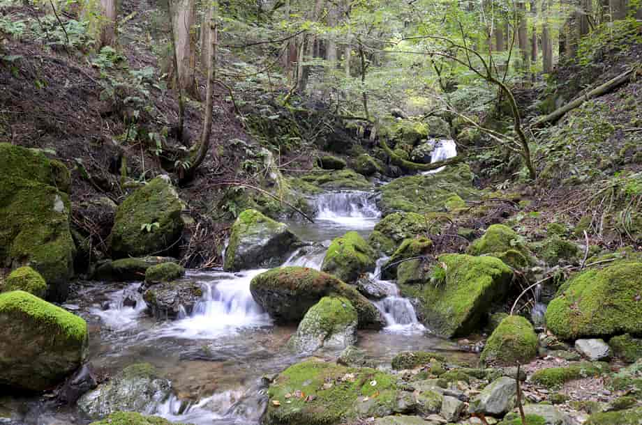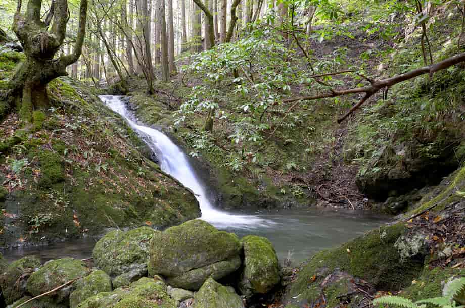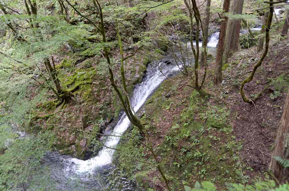 兵庫県養父市畑地区にある「不動滝」は、同地区を流れる畑川に流れ落ちている。 林道からでも見ることのできる滝で、他の不動滝との混称を避けるため、ふつうは「乙屋不動滝」とも呼ばれている。 乙屋不動滝は、大きく見ると上下二段の滝だが、林道からだと、主に上段の滝を見ることができる。 しかし、大きい滝ではないのだが、上流側にも渓流滝が続いているのが目に入り、この時の光景は印象に残る。 林道から斜面を斜めに降りていくと、案外簡単に上段の滝前に立つことができるが、落差は5〜6m程だろうか。 林道から見る方が落差があるようにも思えるが、滝前からだと、上方部分に段差があるのがよく分かる。 比較的広い滝壺も見られ、滝前も開けているので清々しい。 滝壺からの水は左へと流れているが、その流れは少し離れたところで下段の滝をつくっていて、やはり6〜7m程の落差があるように見える。 ただ、この時は下段の落ち口辺りから見下ろしているので、はっきりとした落差は分からない。 それでも、三筋程になって流れ落ちる水の様子は不動滝の名前に相応しく、力強い感じを受ける。 下段の滝前へは、付近の斜面はかなり急なので、下流側から沢を遡ってくることになるのだろうが、下流側の様子を見ると、案外時間がかかりそうなので、この時は斜面からの眺めにとどめておいた。 ところで、「不動滝」の名前が付いているので、付近には不動尊などが祀られているだろうと見渡してみたが、この時は確認することができなかった。 単に見つけることができなかったのかもしれないが、滝前の様子などを窺うと、かつては石仏や祠などが祀られていたようにも感じられる。 いずれにしても、周辺は乙屋渓谷と呼ばれていて、小さな滝がいくつも見られるが、この乙屋不動滝は、それらの中でも特に大きな滝のようで、辺りの景観と共に、清々しい印象を受ける。 乙屋不動滝への交通・アクセス さて、乙屋不動滝へは、自動車の場合、北近畿豊岡自動車道・養父インターからだと、インターを降りて右折し、県道70号線を「新井」方面へ向かう。 少しばかり走って行くと、「朝来」方面へ向かう県道136号線への分岐があるので、この分岐を左折して、建屋川を渡る。 分岐には信号機や住所表記などはないが、手前の案内標識に注意すればよい。 また、この分岐の先には北近畿道の高架が見えているので、その手前を左へ曲がる。 左折してしばらく走って行くと、道路右手に乙屋神社があるので、このすぐ先の分岐を右へ入る。 この分岐にも信号機などはないが、分岐のところには、「畑」のバス停があり、乙屋神社もよく目に留まるので、間違うことはないと思う。 右折してからの道も舗装されているので、特に問題はなく、そのまま道なりに走って行く。 道は集落の中を通っていくが、途中の分岐はどちらを進んでも同じところに出るので、右の道を進んだ方がやや走りやすい。 集落を過ぎた辺りから、所謂林道になるが、この道も舗装されているので道なりに進んで行くようにする。 林道の途中にも右への分岐があるが、この分岐は、そのまま沢沿いに進むようにする。 やがて、林道左側がやや広くなっているところがあるので、ここが上段の滝の上辺りになる。 少し先にも、やや広くなっているところがあるので、それにも注意しておくとよい。 また、上段の滝の上流部にある渓流滝も目に留まるが、滝自体は見えづらい。 ここを行き過ぎてしまうと、橋が架かっているので、その橋まで行くと行き過ぎているので注意する。 ここまで、養父インターから10〜15分程で、自動車は、林道の広くなっている所に駐車することができるが、それほど広い場所ではないので、転回時には注意した方がよい。 林道から斜面を降りて、5分もあれば上段の滝前に着く。 尚、養父インターから自動車で10分程のところに「明神滝」があるので、時間があれば足を延ばしてみるのもよい。 |