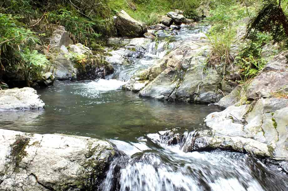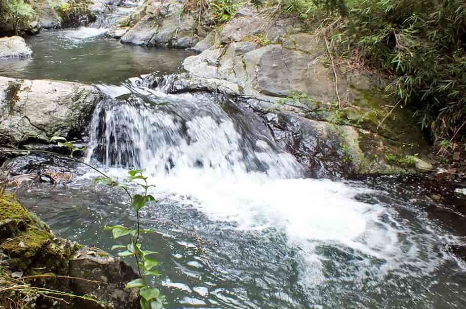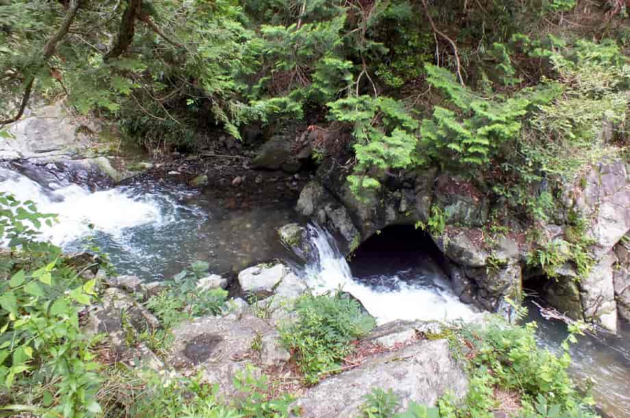 京都府井手町にある「岩壺」は、多賀地区を流れる玉川に流れ落ちている。 落差は1〜2m程の小さな渓流滝だが、大きな甌穴が目に留まる。 この甌穴が「岩壺」と呼ばれているが、甌穴は、岩の窪みなどに砂粒などが流れ込み、長い年月をかけて丸い穴のように削られたもので、この甌穴は下段部分の左岸側に見られる。 流れの途中などで、川底に向かって開いているものや地表に現れている甌穴などは時折目にするが、このように横に向かって開いているのはあまり見ないように思う。 岩壺は道路のすぐ横にあるのだが、道路から僅かな距離を降りてくると、正面辺りにこの甌穴が目に入る。 名前のように、大きな岩を削って壺になっているようでおもしろい。 上段部分は所謂渓流滝で、そのすぐ上にも渓流滝らしいものが流れ落ちている。 甌穴から先の渓流滝の方が落差があるが、この甌穴が岩壺の見どころになっているのだろう。 道路のすぐ横にある滝だが、岩に腰掛けて眺めていると、あまり自動車なども通らないようなので、水音だけが聞こえてくる。 岩壺への交通・アクセス さて、岩壺へは、上流側にある「大正池」を目指すと分かりやすい。 最寄りの駅は、JR奈良線・「玉水」駅になるが、駅からだと府道321号線(和束井手線)に入って、そのまま道なりに東へ進めば、道路右手に「名勝・岩壺」の案内標識が立てられている。 小さな案内標識なので見落としてしまいそうだが、ここから僅かな距離だが遊歩道が延びていて、降りると岩壺を一望できる。 ここまで、徒歩だと玉水駅から1時間半はかかるが、自動車なら玉水駅付近から10〜15分程度で岩壺に着き、更に5分も走れば大正池に着く。 尚、大正池はダム池だが、キャンプ場も併設されていて、周辺は自然の様子がよく残されている。 大きな池の周りは遊歩道が整備されているので、時間があれば散策してみればおもしろい。 また、同地区には「龍王の滝」もあるので、足を延ばしてみるのもよい。 |