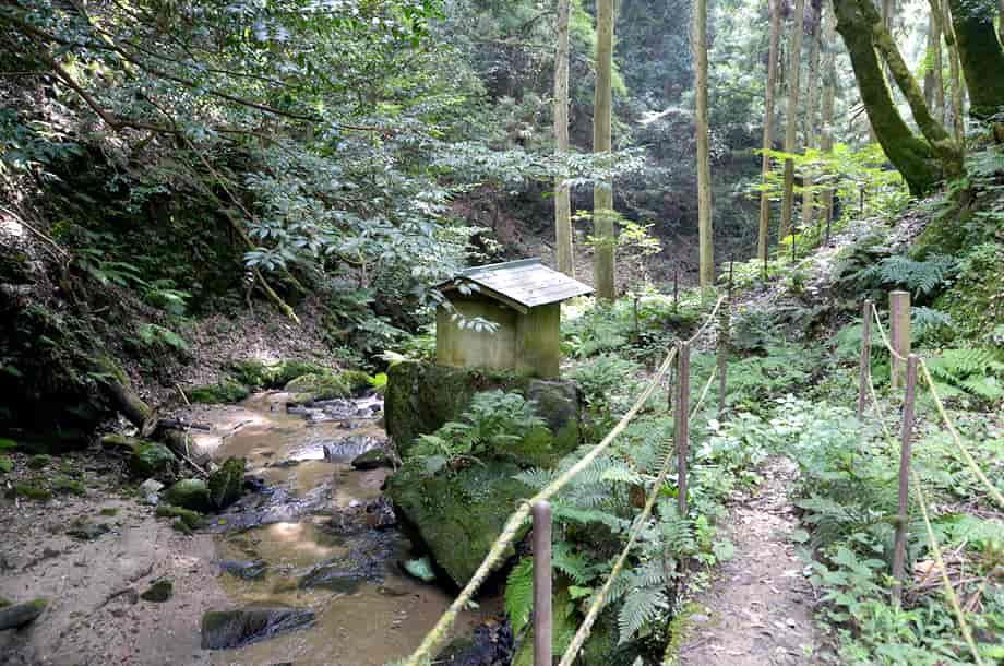 | ▲下から見た滝への道 | ▲手前にあるお堂・すぐ奥に滝が見える |