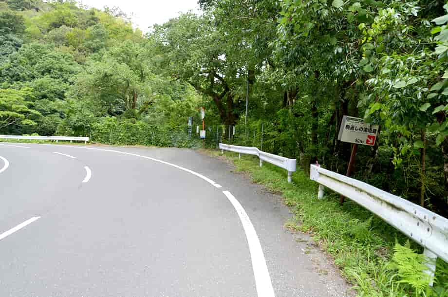 京都府京丹後市にある「駒返しの滝」は、大宮町延利地区を流れる男山川の枝沢に流れ落ちている。 落差5m程の斜瀑だが、階段状のようになった岩肌がおもしろい。 この岩肌のため、水は波打つように流れ落ちていて、力強くも感じられる。 近くには、小さいながらも発電所もあるようなので、普段から水量は多い方なのだろう。 また、駒返しの滝は信仰の対象にもなっていて、滝近くにはしっかりとしたお堂が建てられている。 遊歩道入り口には「駒返しの滝地蔵」と書かれているので、お堂には地蔵尊が祀られているのだろうが、このお堂の向かい辺りには説明板を兼ねた標柱が立てられている。 この標柱近くの岩には、古いものなのではっきりとは分からないが、摩崖仏が彫られている。 「駒返しの滝地蔵」と呼ばれているものはこの摩崖仏で、室町時代に彫られたものとされている。 随分と古くから信仰されてきたことが分かるが、周辺は整備されているので、今でも熱い信仰を集めているのだろう。 現在はしっかりとした道路が滝上に造られているが、かつては山深いところで、この摩崖仏が彫られたころには、山道を往来するにも、さぞかし苦労したことだろう。 ところで、「鮎返しの滝」などは時折聞く名前だが、「駒返しの滝」とはあまり聞かない。 標柱にある説明書によると、「用明天皇の皇子・麻呂子親王が、丹後地方の鬼賊退治に向った時、竹野郡竹野に行こうとして馬を進めたが、ここに来て進み得ず、馬を返したという」と、概ねそのように記されているが、それが「駒返し」の由来になっている。 駒返しの滝への交通・アクセス さて、駒返しの滝へは、自動車の場合、宮津方面からだと、国道176号線を西へ進み、「消防署前」の交差点で「伊根」方面へ向かう国道178号線へと右折する。 道なりに走って行くと「男山」の交差点があるので、ここを左折して府道53号線へ入る。 この交差点の住所表記は分かりづらいが、手前に「← 府道53号線・京丹後」の案内標識があるので、それにも注意するとよい。 あとは、道なりに走って行くと、道路右手に「駒返しの滝地蔵 50m →」の案内標識があり、その先には「駒返し発電所」の標柱も立てられている。 自動車は、この標柱の辺りがやや広くなっているので駐車することができるが、緩いカーブの所でもあるので、駐車位置には注意する。 ここまで、府道53号線に入ってから5分程で、京都縦貫自動車道・与謝天橋立インターからでも15分もあれば着く。 滝前には、案内標識のところから遊歩道が延びているので、そのまま歩いて行けば、5分もかからずに滝前に着く。 遊歩道はよく整備されていて歩きやすく、地蔵堂の先には簡易ながらも橋が架けられているので、橋の上からだと正面に滝を見ることができる。 また、滝から右手にある建物が「駒返しの滝発電所」になっていて、奥には連滝のような流れも見える。 |