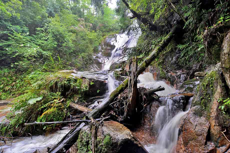 京都府南山城村にある「不動の滝」は、童仙坊地区を流れる和束川の支流に流れ落ちている。 落差15m程とされているが、この時は生憎の降雨で水量が多く、滝前から眺めることなどができなかったので、詳しくは分からなかった。 手前には倒木もあり、岩肌も濡れているので、限られた場所から眺めるに留まったことは残念だが、水量が多いだけに迫力が感じられた。 降雨で対岸に渡ることもできなかったが、全体の様子は不動の滝らしい力強さもあり、水の流れにも変化がある。 信仰の滝でもあり、滝の右側には不動尊が祀られているらしいが、残念ながら、この不動尊も降雨などのため、拝見することはできなかった。 それでも、この不動滝は南山城村の観光パンフレットなどにも紹介されているだけあって、見応えのする滝ではある。 下流側の様子なども気になるが、違った角度から見れば、様々な景観を見せてくれそうな滝でもあり、条件のよい時に再訪してみたい滝でもある。 不動の滝への交通・アクセス さて、不動の滝へは付近にある「高麗寺」を目指せば分かりやすい。 ただ、不動の滝も高麗寺も、童仙坊地区でも奥にあるので、やや分かりづらいかもしれない。 自動車の場合、南山城村役場からだと、役場前の府道28号線を東へ向かうと、小さな橋を渡った先に信号機のある交差点があるので、ここを左折する。 交差点の左には「← 5km 童仙房」の案内標識と、木津警察署・大河原駐在所もあるのですぐに分かる。 左折し少し行くとふたつのカーブミラーがある三差路があり、「← 高麗寺」の標識があるので、ここを左へ曲がる。 この辺りは道幅が狭いので注意して進んで行くようにした方がよい。 しばらくは道なりに走って行くが、途中の分岐などには「高麗寺」への標識があるので、それに注意しながら進んで行く。 役場から25〜30分ほど走ってくると、道は分岐していて、正面に「高麗ハイツ」の建物がある。 この建物は大きくて見落とすことはないので、ここの分岐は直進するように左へ進む。 「高麗寺」へはここを右へ曲がるが、不動の滝は左になるので注意する。 ここからも道なりに山の方へ進んで行くが、途中の分岐は、いずれも右折する。 「高麗ハイツ」の分岐から4〜5分程で林道の終点になるので、自動車はこの辺りのやや広いところに駐車することになる。 ここからは散策路のようになっている山道が延びているので、そのまま道なりに15〜20分程歩いて行くと滝前に着く。 山道は整備されていて歩きやすく、迷うようなこともない。 滝近くはやや勾配があるが、特に歩きづらいことはない。 また、木津川方面から国道163号線を利用する場合、「北大河原トンネル」を抜けた先に左への脇道があるので、この脇道へ進むと、木津警察署・大河原駐在所の分岐を左折した道に合流する。 |