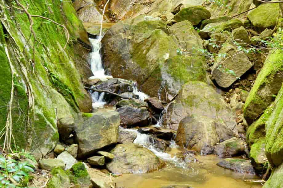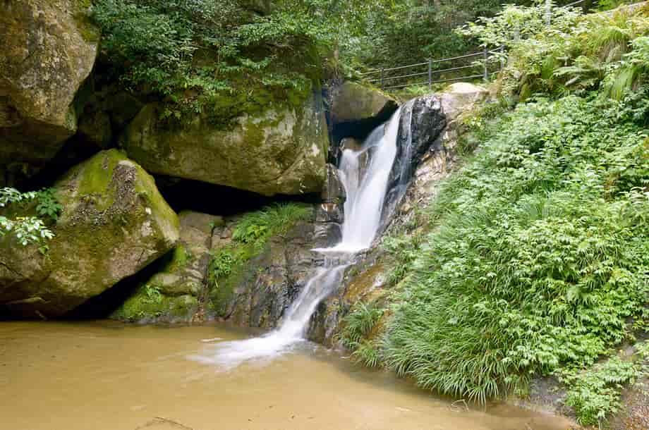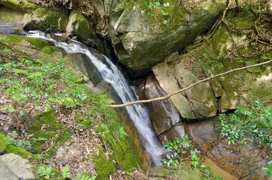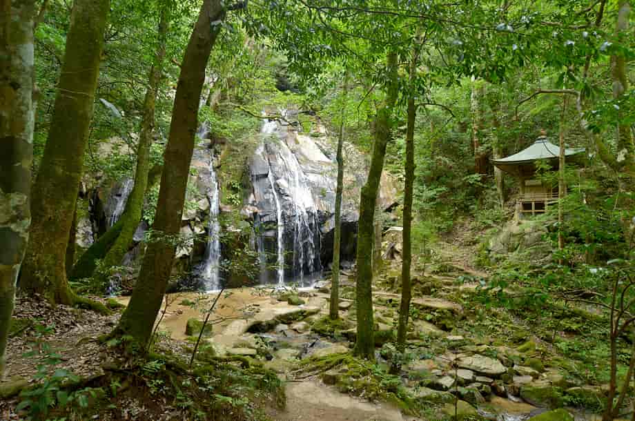 京都府宮津市にある「臥竜の滝」は、滝馬地区にある金引の滝の下流側に流れ落ちている。 上流側にある「白竜の滝」、金引の滝と合わせて「金引三瀑」、或いは三滝を合わせて「金引の滝」と呼ばれることもある。 臥竜の滝は金引の滝へ向かう遊歩道に入ってからはじめて出会う滝で、入り口から少し歩いて行くと見ることができる。 落差は3〜4m程で、遊歩道から見ることができるが、これは主瀑のようで、全体の様子を見るのは難しい。 全体が見づらいのは残念だが、主瀑を見下ろせる場所から少し手前の遊歩道から見ると、臥竜の滝は何段かの段瀑になっているのが分かる。 その辺りから見ると、落差も10m程はあるのではないかと思う。 それにしても、付近に名板などがないので、通り過ぎてしまう人も多いようだが、あまり目立たないこの滝を「臥竜」と名づけたのは、妙を得たとも感じられる。 また、臥竜の滝は大きな滝ではないが、すぐ上にある白竜の滝と共に、「双竜の滝」として見てもおもしろいように思う。 臥竜の滝への交通・アクセス 臥竜の滝は金引の滝への遊歩道の途中にあるが、金引の滝までの交通はそのページで紹介しているので、臥竜の滝は、遊歩道の入り口から少し歩いて行ったところにある。 遊歩道はよく整備されていて、緩やかな石造りの階段を少し登って行くと右側に見える。 |