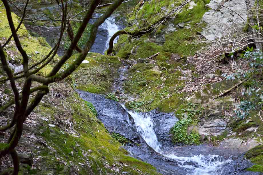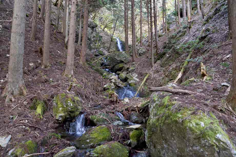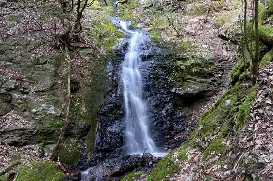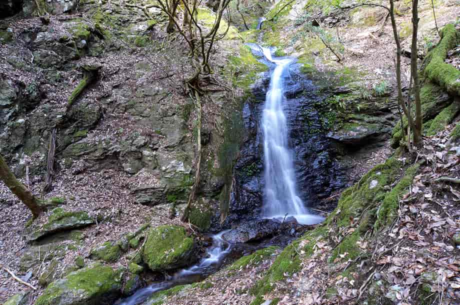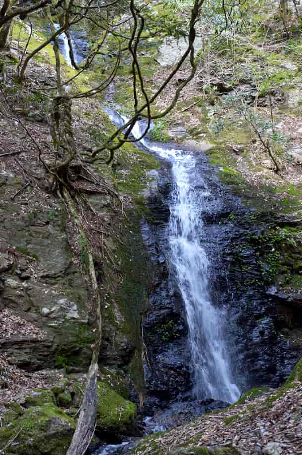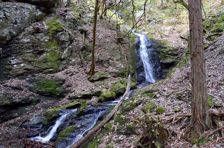 京都府南丹市にある「佐々里の滝」は、美山町佐々里地区を流れる佐々里川の支流の枝沢に流れ落ちている。 落差は20m程だと思うが、左へと向かう下段部の辺りを入れると、25mか、それ以上の落差はあるようにも見える。 全体は幾段かの段瀑になっているが、落ち口辺りになる上段部分はよく見ることができない。 特に、植物が繁茂する時期だと、葉隠れしてしまってほとんど見えなくなるかもしれない。 しかし、佐々里の滝は思っていた以上に素晴らしい滝で、奥行きがあり、流れにも変化があって味わいがある。 以前は、滝前に倒木があったり、道路からではよく見えないようだったらしいが、周辺はやや整備されたようで、佐々里の滝は道路からでも遠望することができる。 道路からだと、主瀑とも言える部分を見ることができるが、道路から少し足を踏み入れると、主瀑から流れてくる水の流れが、ずっと続いているのも見て取れる。 佐々里の滝は思っているよりも大きな滝で、落差と奥行きがあることに少しばかりの驚きがある。 滝前までも、はっきりとした道はなく、僅かな倒木はあるが、特に問題なく近づくことができる。 道路から眺めても、滝までの周辺は整備された様子が窺えるので、5分もかからずに滝前に行くことができる。 また、佐々里の滝は、主瀑を中心に正面辺りから眺めるよりも、左へと流れている部分を含めて、やや離れて見た方が味わいがある。 少し離れて見ると、水の流れもおもしろく、全体は大きな滝であることもよく分かる。 佐々里の滝への交通・アクセス さて、佐々里の滝へは、美山町佐々里地区へと向かうことになるが、自動車の場合、園部方面からだと、府道19号線を美山方面へ向かって北へ進んで行くと、「上平屋」の交差点で国道162号線と交差するので、ここを「京都」方面へ向かって右折する。 しばらく走っていくと「安掛」の交差点があるので、ここを左折して「広河原」の方へ入っていく。 左に入った道は府道38号線で、あとはそのまま走っていく。 途中、道路左に「蓮如の滝」があるので、寄ってみるのもよい。 蓮如の滝は遠望することになるが、落差70m程の大きな滝なので、すぐに分かる。 蓮如の滝やその先にある「美山かやぶきの里」などを通り過ぎてしばらく進んで行くと、やがて「芦生」方面へ向かう「出合」の分岐があるが、ここも右の方へ曲がる府道38号線へと進む。 この分岐を過ぎたあたりからカーブも多くなり、道幅が狭いところあるので、注意しながら進んで行くようにする。 やがて「佐々里」の分岐があるが、ここは突き当りのような二叉になっているのですぐに分かる。 ここを左の府道38号線へ0.8〜1km程進むと、左に短いガードレールがある。 佐々里の滝は、このガードレールの奥にあり、道路からでも遠望できるので見落とすことはない。 ここまで、「安掛」の交差点からだと35〜45分程度だが、辺りの道は幅が狭いので、駐車する時には注意する必要がある。 滝までははっきりとした道はないが、距離が短いので、大体の見当をつけて進んで行けばよい。 この時は、左岸から入って、途中で一度渡渉してから、再度左岸へ戻ったが、滝前まで5分もかからない。 滝前まで行くと、小さいながらも滝壺もあるのが分かる。 ただ、周辺は開けてはいるが斜面が多いので、足元には注意した方がよい。 尚、「佐々里」の分岐から右の「この先行き止まり」となっている方へ5km程進んで行くと「布滝」がある。 但し、途中からの道は、自動車だとやや走りづらくなる。 |